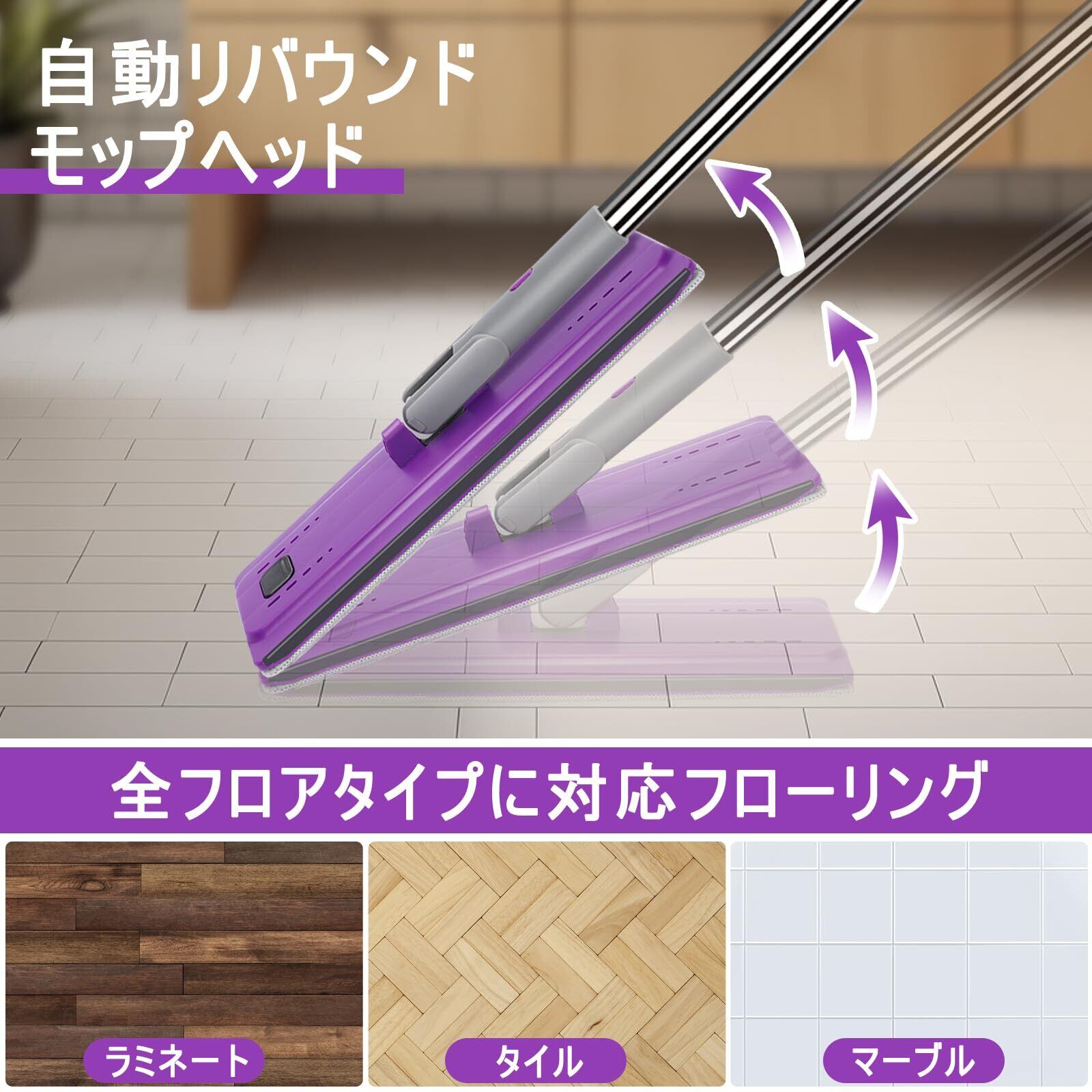 360°回転モップヘッド:フラットモップヘッドは360度回転できます。狭い場所にも入りやすく、手の届きにくい家具の下、コーナーや階段の掃除も簡単になります。モップヘッドの縁にはシリコンスクレーパーがあり、頑固な汚れに対応し、水切れもよいです。