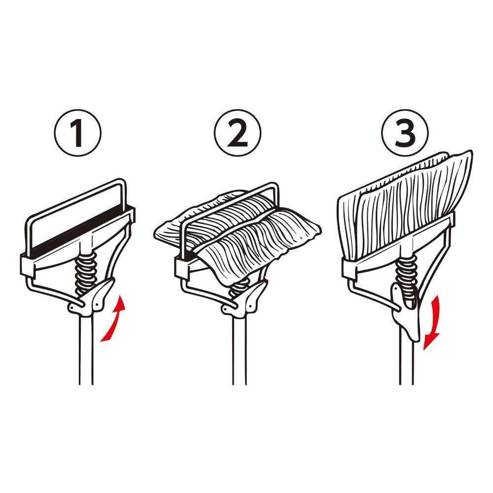 【レバーで簡単装着、しっかり固定】レバーを引き下げれば緩み、レバーを引き上げれば固定します。レバーの上下だけで簡単にモップ糸を装着できます。スプリングを使った固定方法なのでしっかりとモップ糸を固定します。清掃中、モップ糸がぐらつくことはありません。