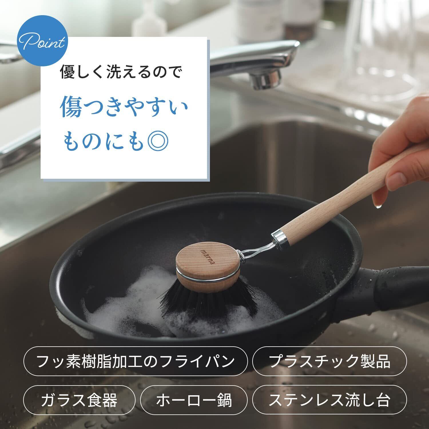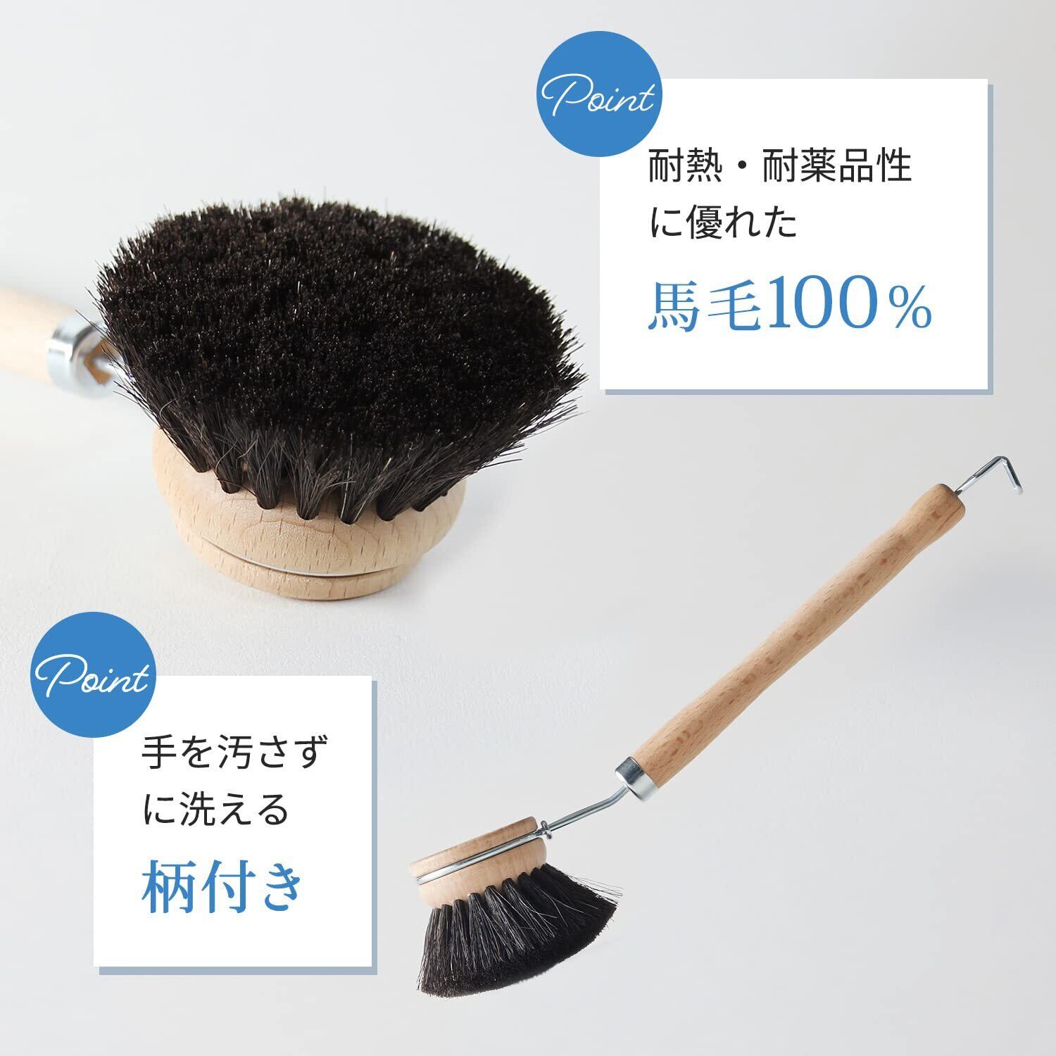 【馬毛使用で優しく洗える】耐熱・耐薬品性に優れた馬毛を100%使用。フッ素加工樹脂のフライパンをはじめ、ガラス食器、ホーロー鍋、プラスチック製品、ステンレス流し台など、傷つきやすいものにも使用できます。