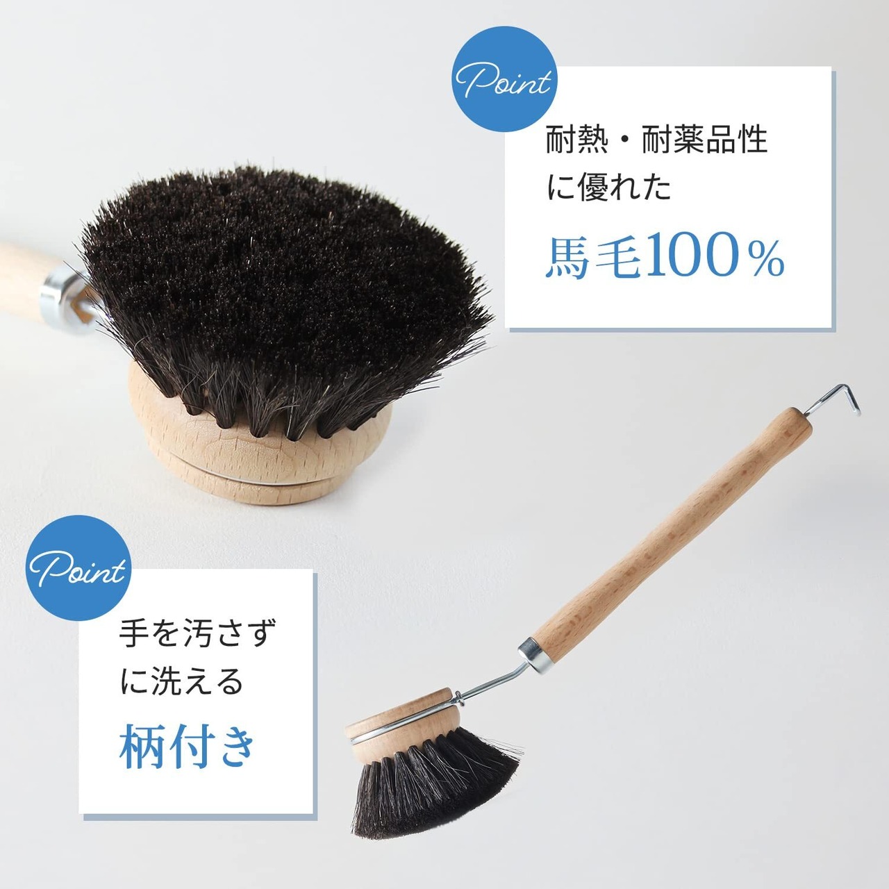 【天然素材のキッチンブラシ】傷つけにくいソフトな馬毛を使用した柄付きのキッチンブラシです。泡立ちがよくスピーディに汚れを落とします。