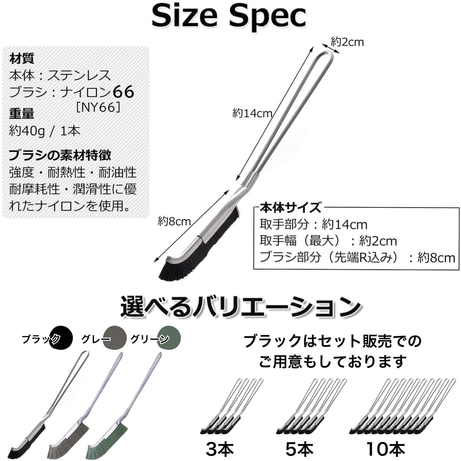 【大成工業ブラシのこだわりと特徴】✨本体はステンレス製でさびにくく丈夫な作りになっております。✨力を加えやすいように指ストッパーが付いており握りやすくなっています。✨細かい隙間や角にブラシの毛が届くように設計された、Jの字のようなカーブをした先端になっております。✨汚れを落としやすく、お掃除場所を傷つけにくい適度な硬さのナイロン毛「ナイロン66」(NY66)を使用しております。✨耐熱性があり、油汚れ等はお湯を使ってご使用いただくことが可能です。