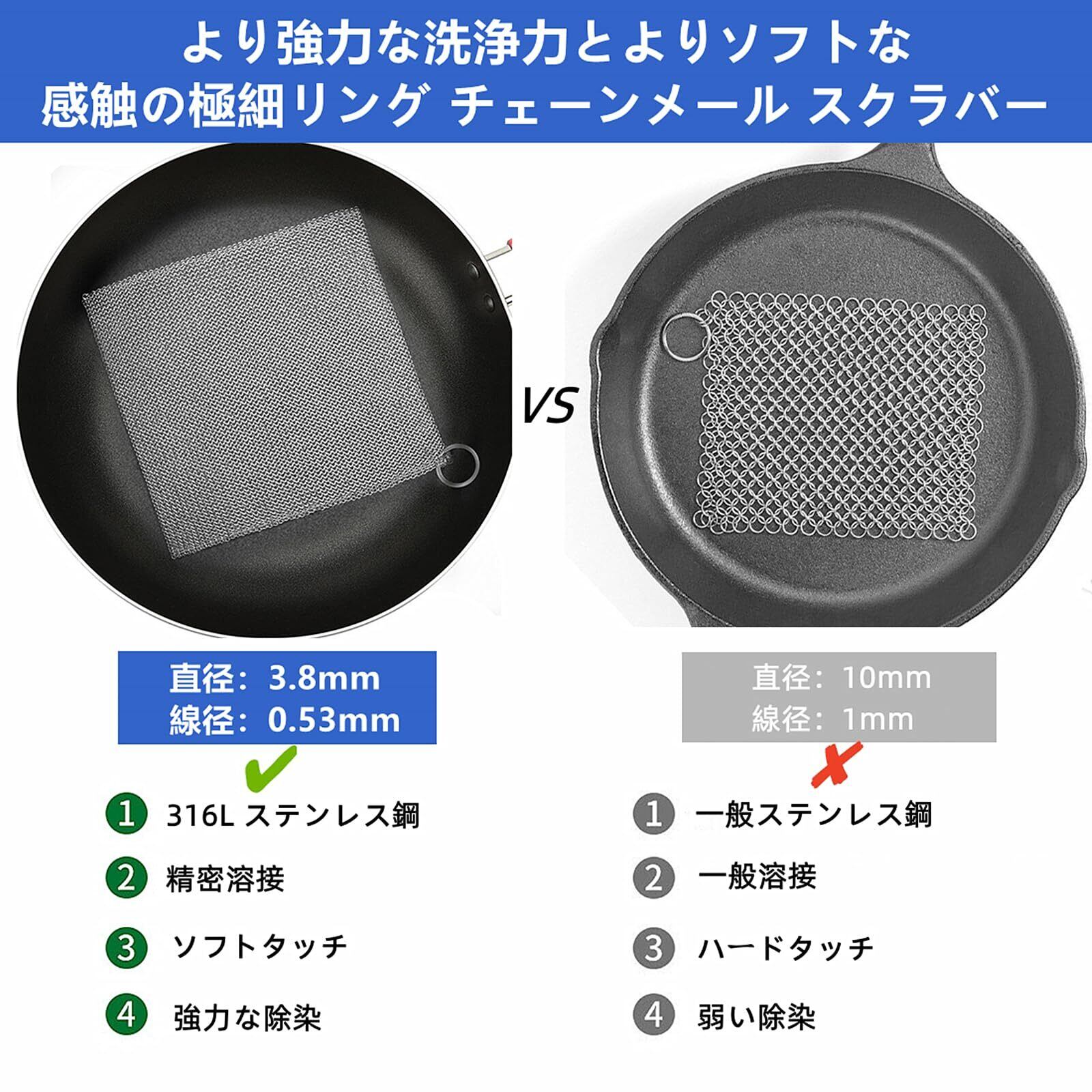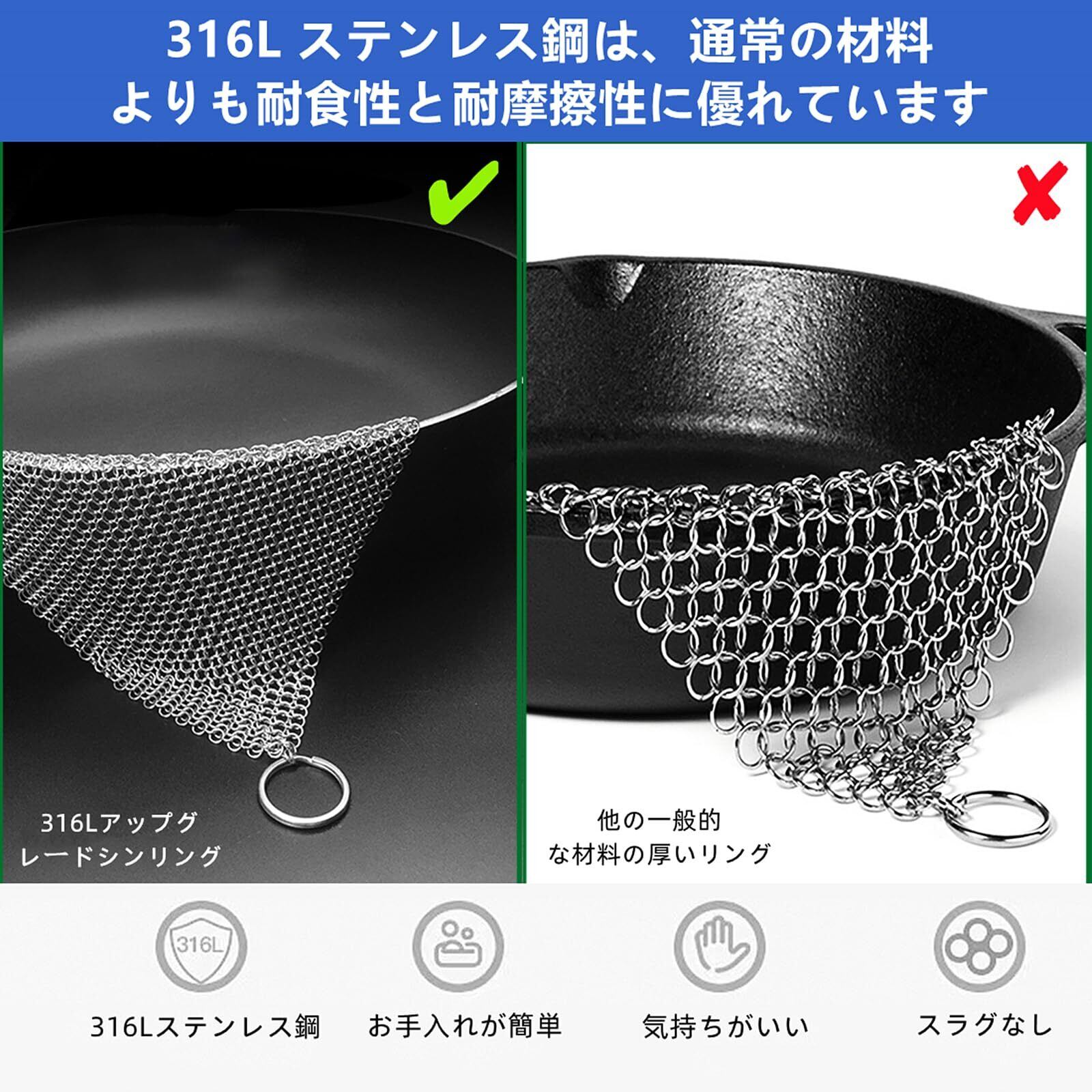 Taspooke 铸鉄クリーナーブラシ - 20x20cm 改良型3.8mm細リング金属たわし、316Lステンレスたわしスクラバー - スチールウール代替、フライパン、鍋、スキレット、グリドル、容器用 簡単洗浄 耐久