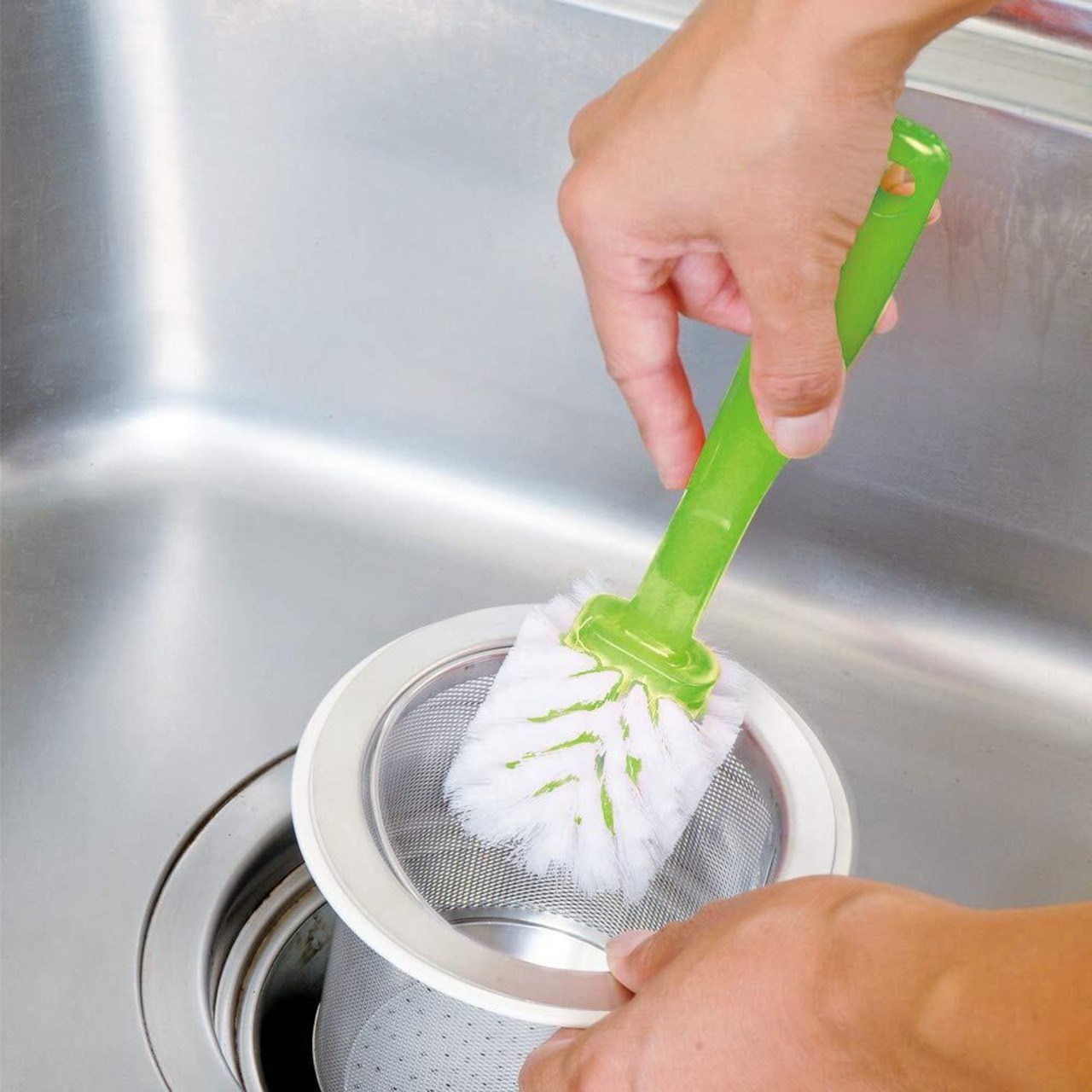 360度植毛されたブラシで排水口内やドレーンカゴの底と側面が一度に洗えます。排水口・ドレーンカゴ・三角コーナー洗いに。
