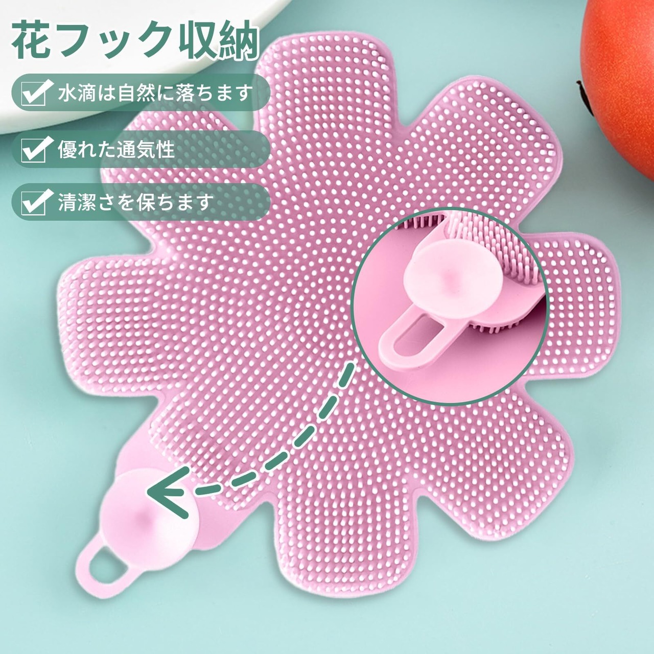 【花型フックで清潔収納】使い終わったらかわいい花型フックに掛けるだけ!水滴が落ちて通気性バツグンなので、カビやニオイを防ぎます。シンク周りもすっきり