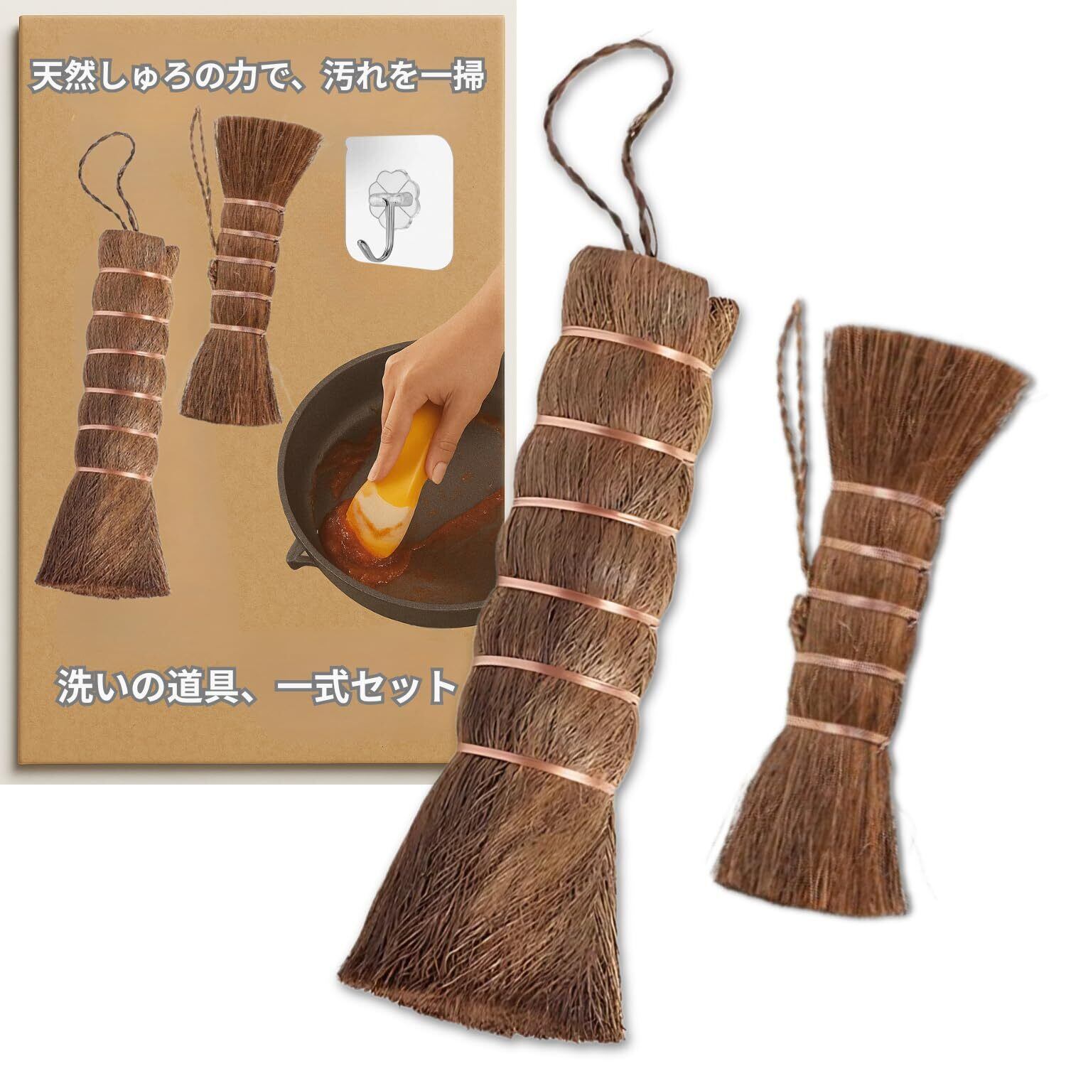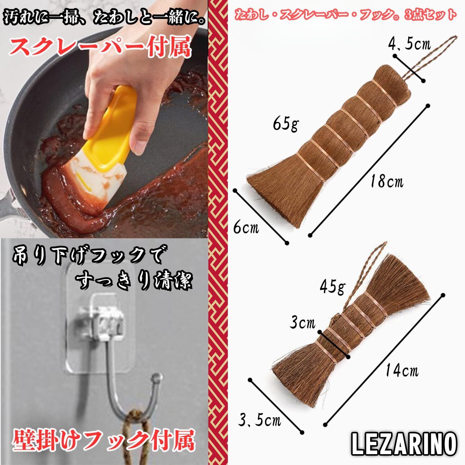 LEZARINO しゅろたわし ささら キッチンブラシ 中華鍋 フライパン スクレーパー フック 3点セット (2個set)