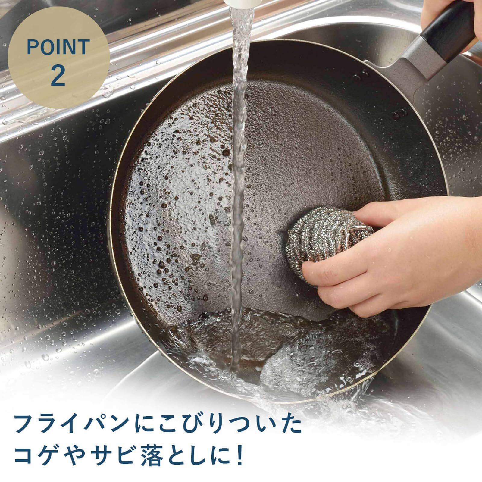 サビに強いステンレス製。鍋やレンジ周りのコゲ、サビ落しに重宝する