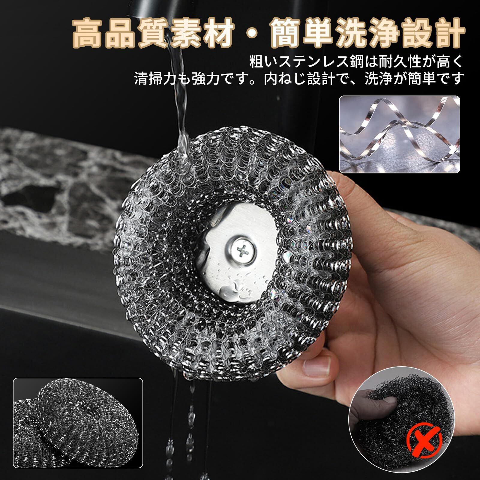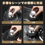 耐腐食性のステンレススチール製で、スポンジでは落とせない頑固な焦げ跡や汚れをしっかりと除去します。