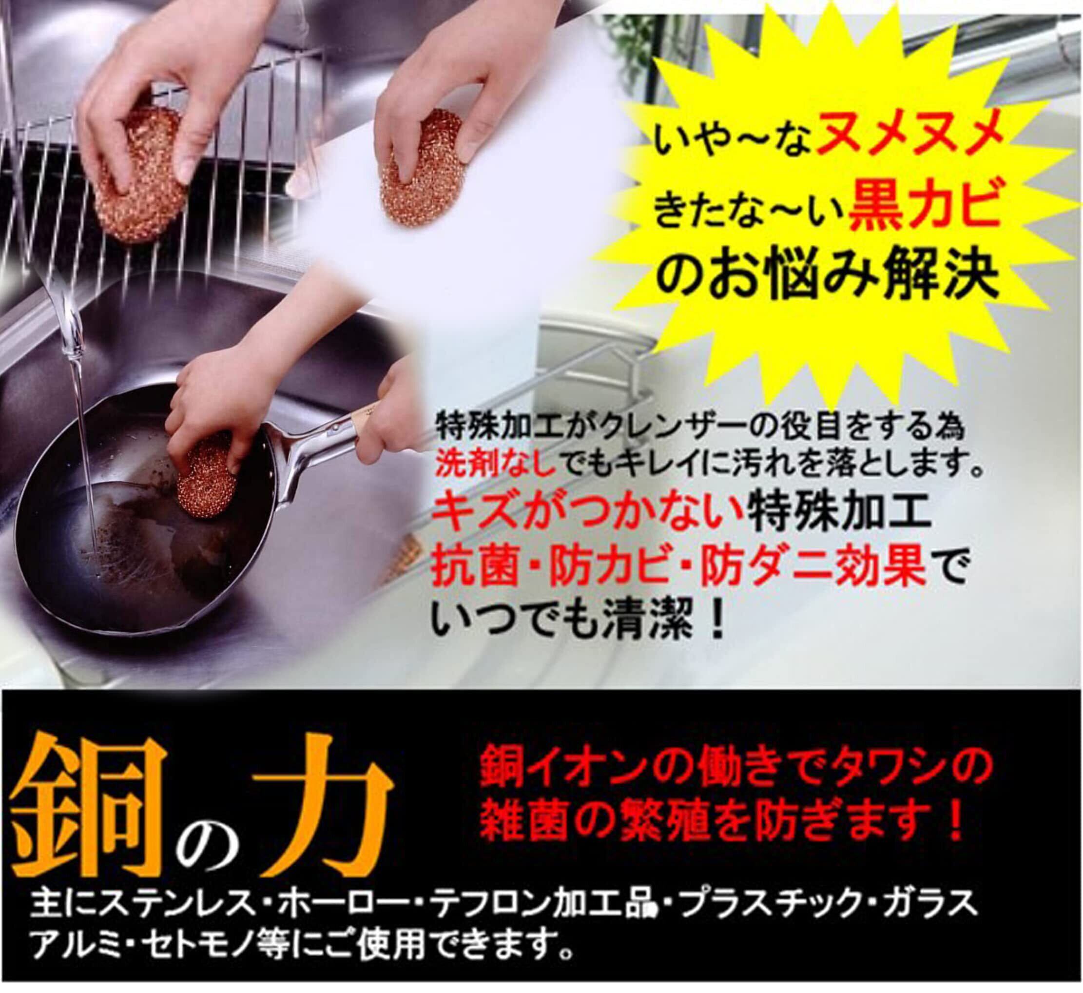 たわしとしてブラッシング。まな板の汚れ落としや、中華鍋などの鉄鍋類などに大変便利です。食器からシンクの洗を始め、 バス・トイレの洗浄に。さらに銅イオンの力で、汚れがつきにくくなる。ヌメリ対策にも