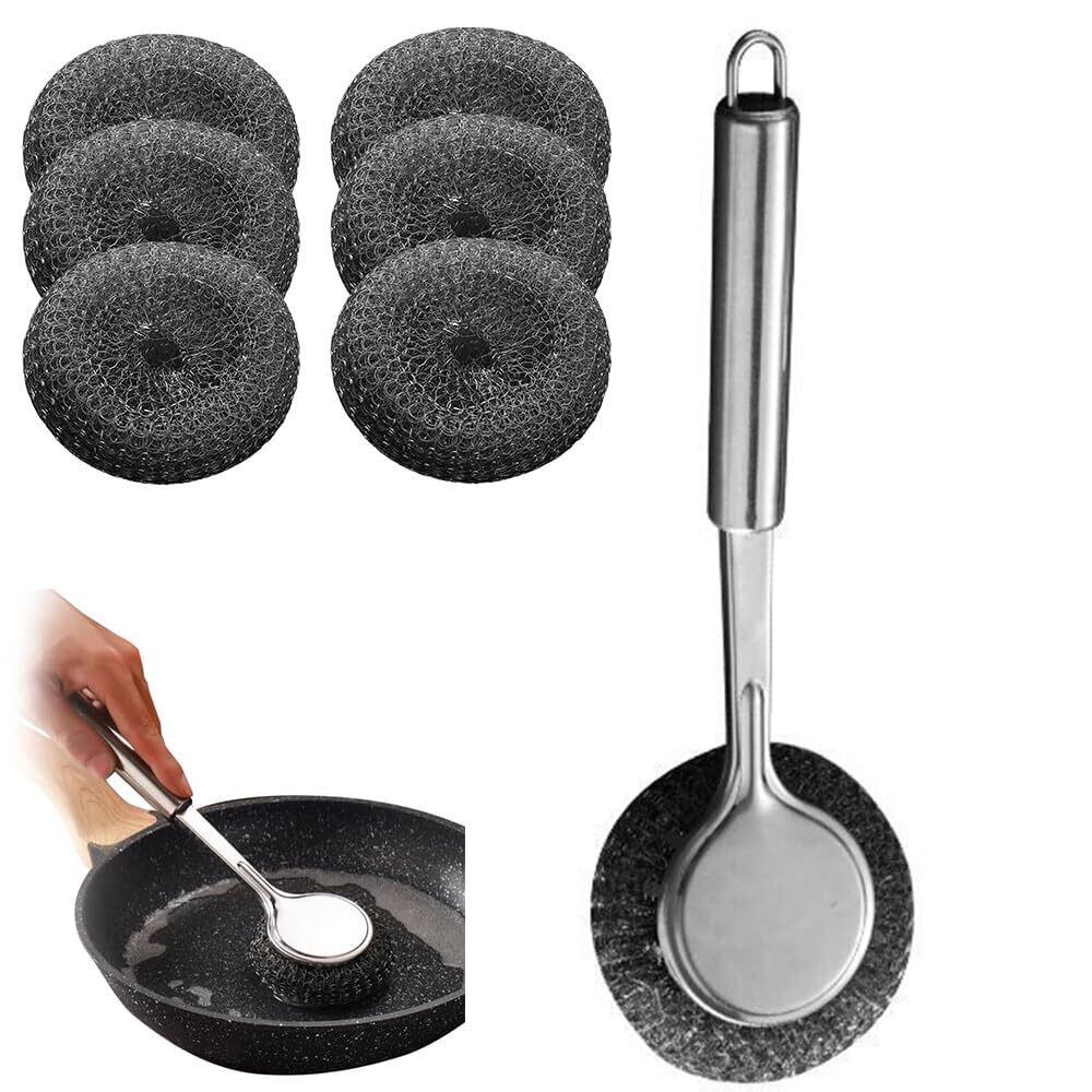 【新着商品】6個セット 金たわし ステンレスたわし 持ち手 本体+替え5個 长柄 かなだわし洗いブラシ 台所用 家庭用 キッチン掃除用