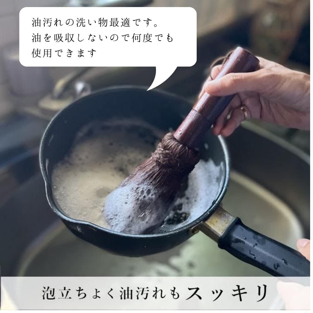 【泡立ちの良さ】油を吸収しないので洗剤の泡立ちが良く、スポンジのようにベタつかないので長くご使用いただけます。