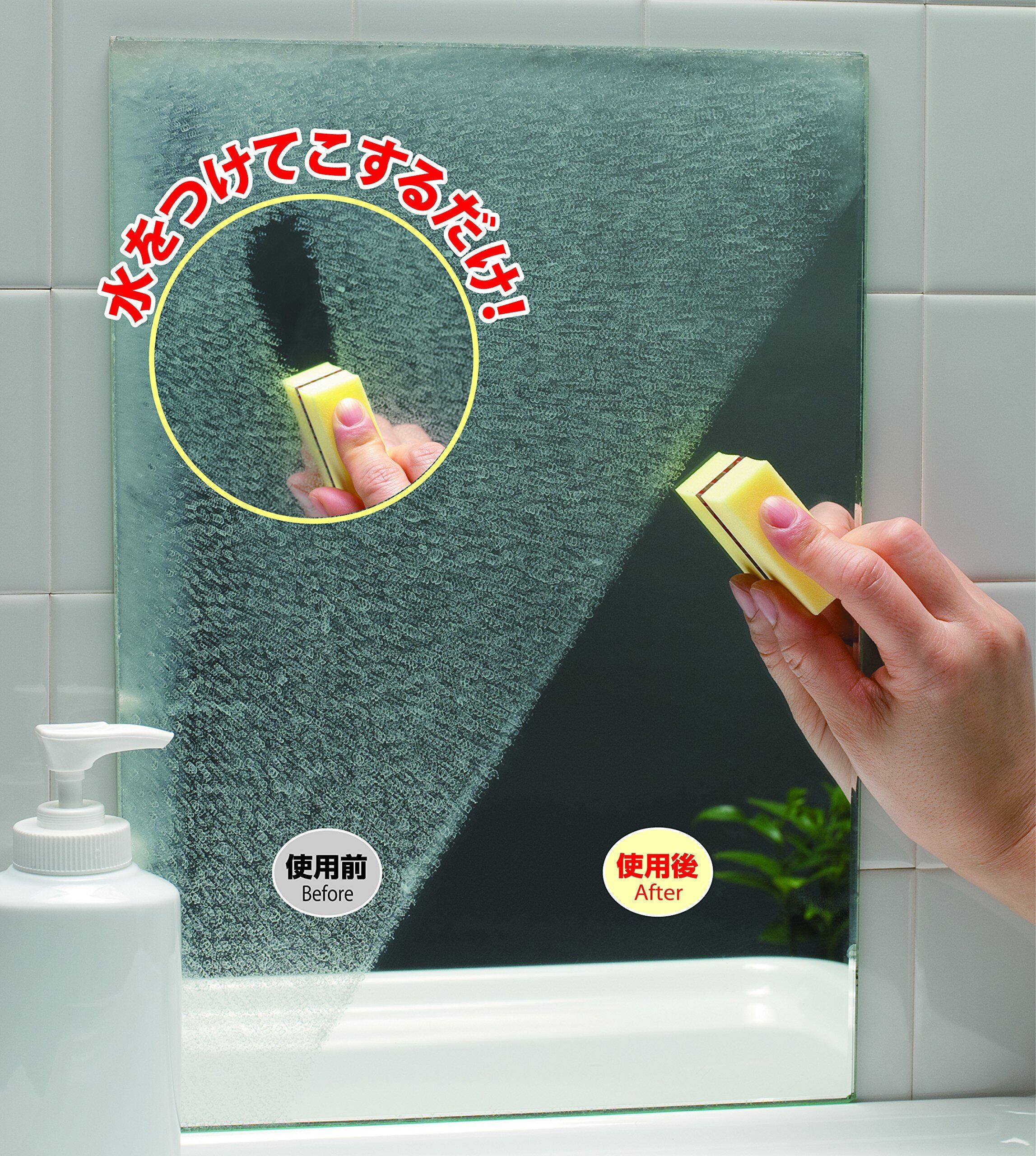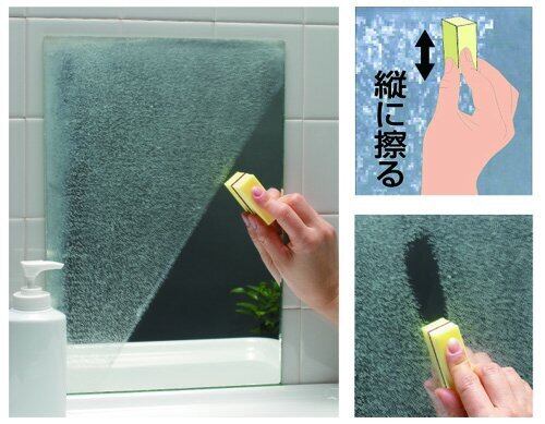 (2)鏡などの汚れの付いた研磨する面に水を付けながら、スポンジの柄面で長い面と平行に均等の力で、同じところを少しずつ擦る。