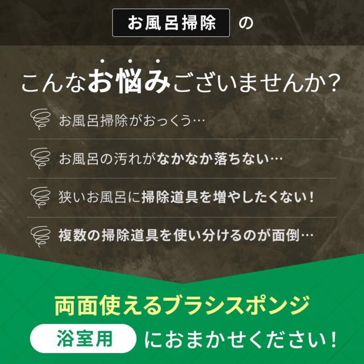これひとつでお風呂まるごとキレイ!両面で使い分けできる浴室用ブラシスポンジです。創業120年のアズマのノウハウを凝縮。人気のW繊維とツンツンブラシをドッキングしました。、洗剤なし、水だけで浴室の汚れを落とせます。