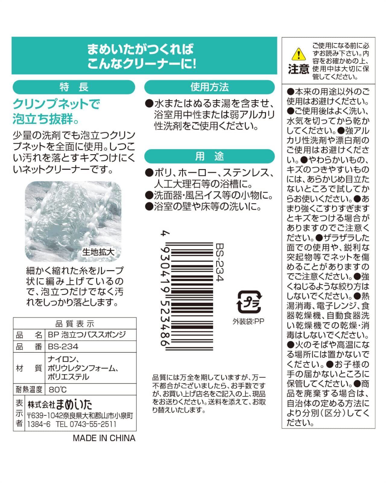 【数量限定】まめいた バススポンジ グレー 幅8cm×奥行5cm×高さ16cm 湯垢 石けん汚れ 落とす 泡立ち ネット キズつけにくい BS-234