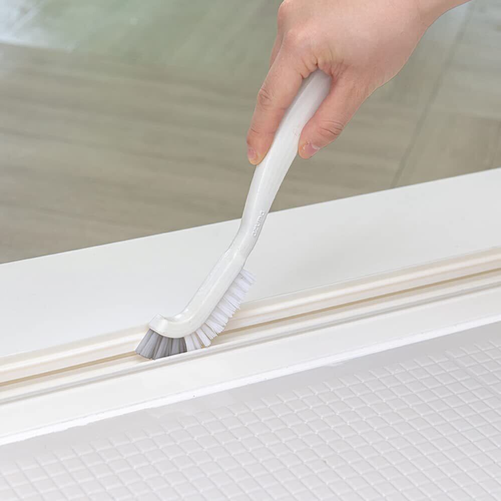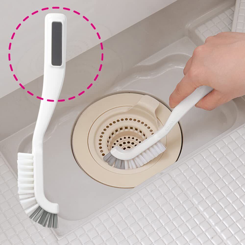 【洗いにくい浴室のスミズミに】スリムなヘッド幅で、溝や狭いすき間もお掃除できます。先端の硬めブラシで角に溜まった汚れやこびりついた汚れをかき出し、やわらかめのブラシで汚れをこすり落とします。