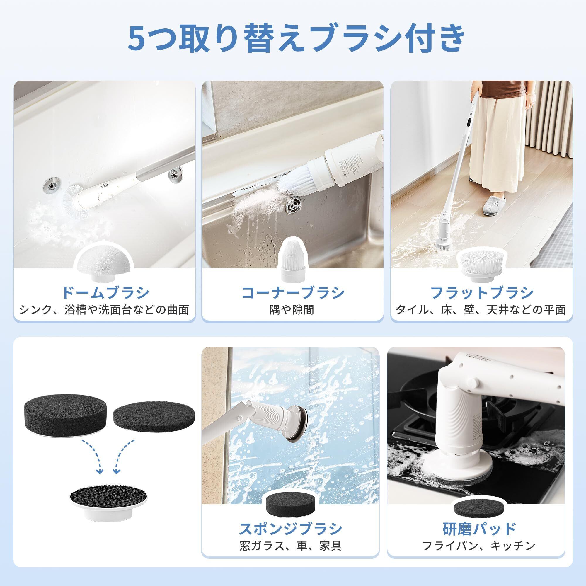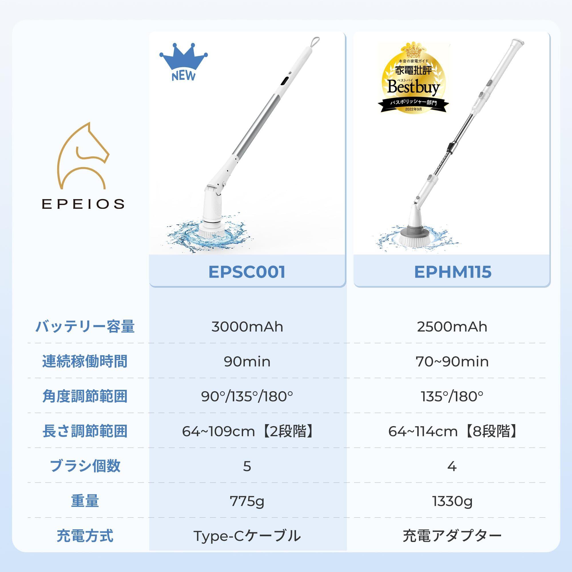 【2024New モデル】エペイオス(Epeios) バスポリッシャー お風呂掃除ブラシ コードレス型 電動お掃除ブラシ 充電式 ブラシ角度調節 長さ伸縮可能 3000mAh大容量バッテリー デッキブラシ 手持ち式 5つ取り替えブラシ付き IPX6防水 操作便利 浴室/床/壁/窓/おふろ/車/ベランダ/トイレ掃除/玄関の掃除/年末掃除 母の日ギフト 花粉対策 新生活 EPSC001
