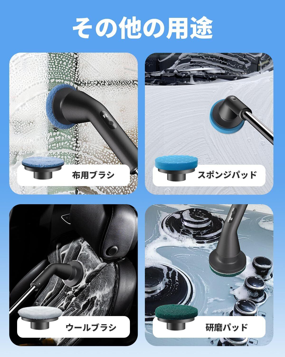 【充実したブラシセットと幅広い用途】当社の電動清掃ブラシには、なんと 7 種類の交換ブラシが付属しています。硬質のタイルやグリルに向けた太ブラシ、柔らかい素材の家具用の細ブラシなど、それぞれに最適なブラシが用意されています。お風呂掃除 ブラシは浴室のタイルやバスタブ、台所の流し台、キッチンカウンター、家具の表面や隙間など、あらゆる場所の汚れに対応し、清掃作業を効率的に行うことができます。どんな難しい汚れでも、このブラシセットを使えば簡単に取り除くことができるバスポリッシャーです。