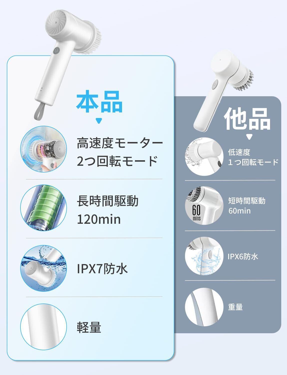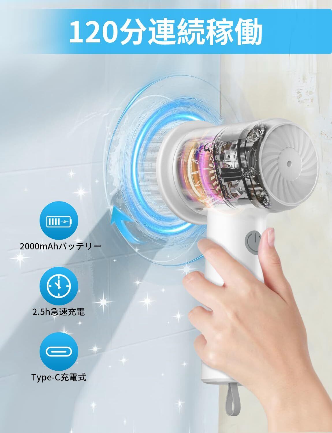 【特価セール】【 限定】IYGLKD バスポリッシャー 電動お掃除ブラシ コードレス お風呂掃除 ブラシ 2000mAh大容量バッテリー 6 種類の交換ブラシ 2つ回転モード 120分間連続使用 IPX7 防水 USB C充電式 電動ブラシ トイレ掃除 軽量 浴槽・床・キッチン・車・壁掃除用 年末掃除 日本語説明書付属