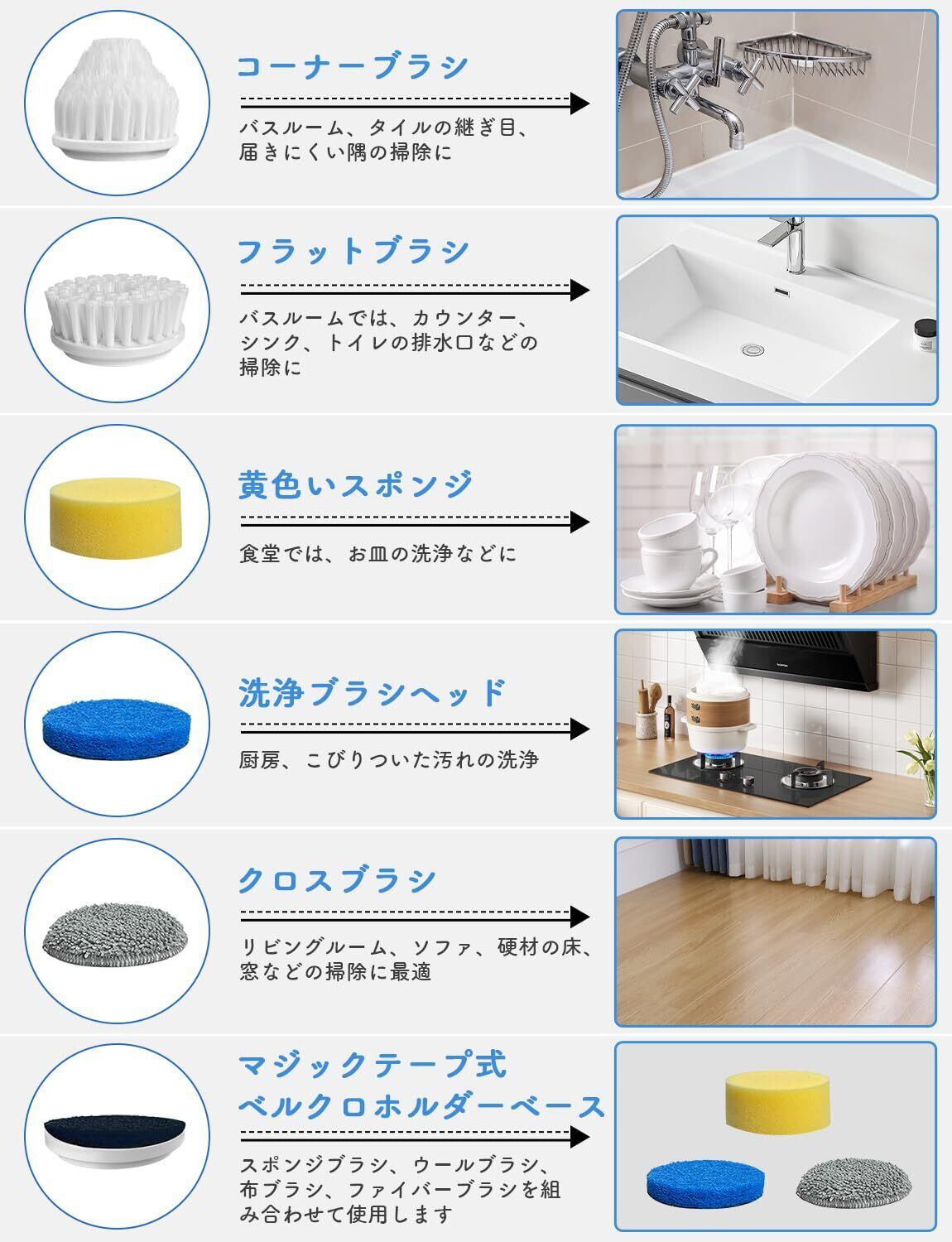 【7in1電動掃除ブラシ】風呂掃除 ブラシは家中まるごと対応!様々な交換可能ブラシで家中のあらゆる汚れを撃退。平ブラシ(浴室・浴槽の水垢)、スポンジブラシ(窓ガラス・車の窓)、マジックテープブラシ(ソファ・布製品のベタつき)、スクラブブラシ(キッチンの油汚れ)。✨ 1台で家中死角なしの徹底清掃!