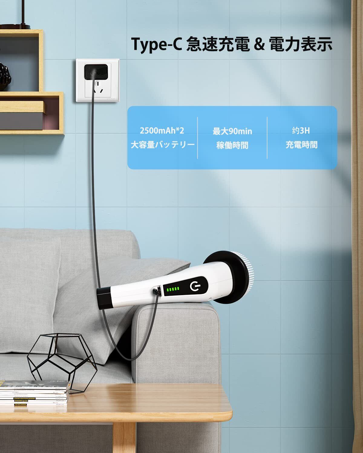 【1回の充電で家全体を掃除】アップグレードされた2500mAh*2バッテリーとUSB-C急速充電技術を採用。Leebein電動バスタブスクラバーは2.5時間で完全に充電でき、60~90分間持続し、家全体をきれいにするのに十分です。 電池残量は機械のLEDライトで確認できます。