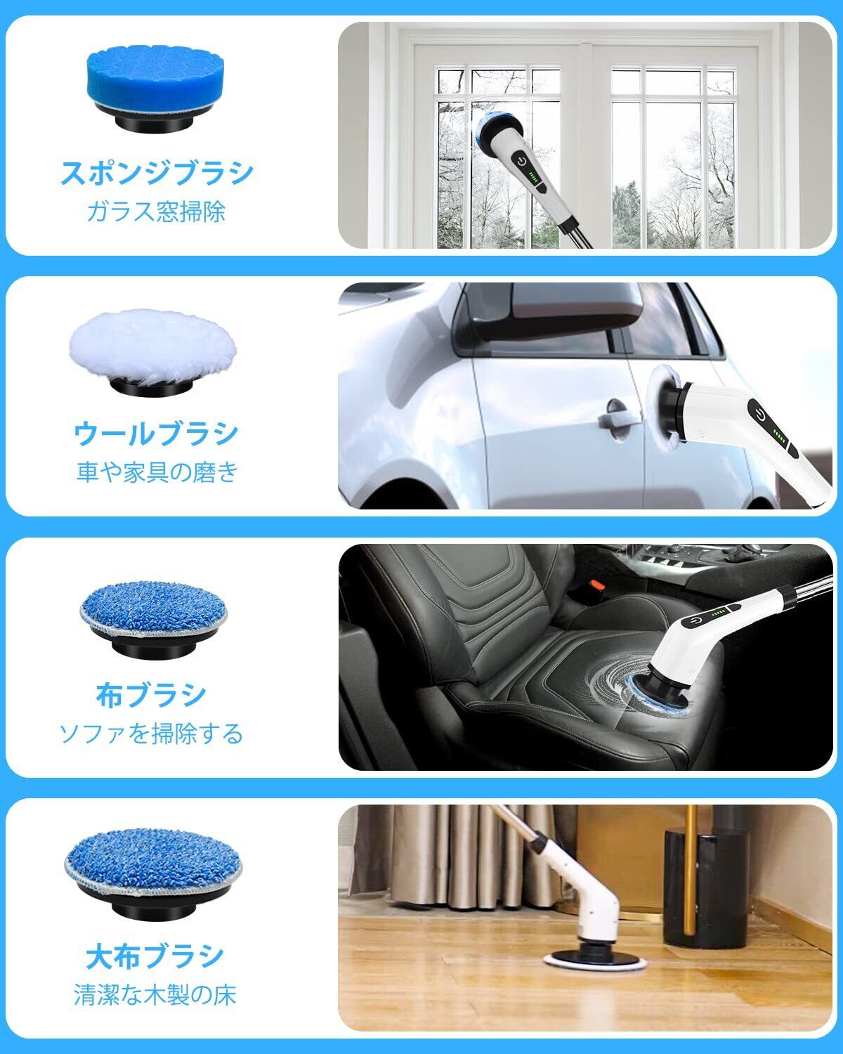 【 8つの替えブラシ&取り外せる3段式設計】8つの替えブラシと3つの長さ(30~137CMに調整できます),さまざまな組み合わせにより、プロセスのクリーニングの難しさが解決します。掃除を楽にし、人生をもっと楽しくします。フラットブラシは、浴室の床や、バスタブ、更に小さいフラットブラシで洗面台やトイレ掃除にも適応。コーナーブラシは壁のコーナ、ドアの隙間などの場所の掃除に適用。スポンジブラシは窓ガラスや、自動車のガラス窓に適応。布ブラシはフローリングの床などに適応。ウールブラシは、ソファーや車磨きに適応。ファイバーブラシは、キッチンの油汚れに適用。