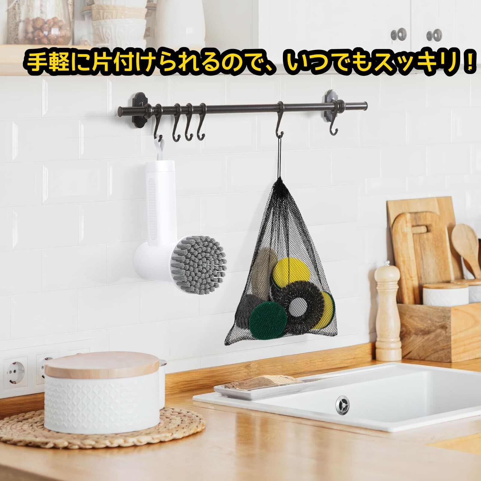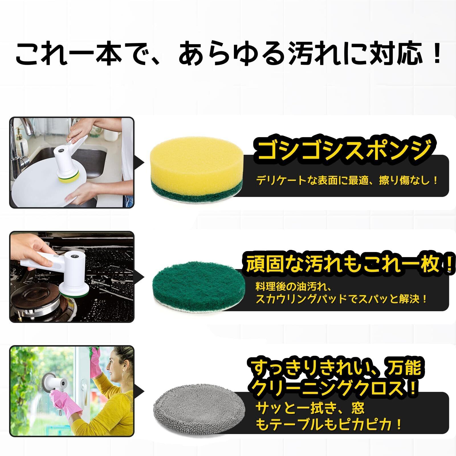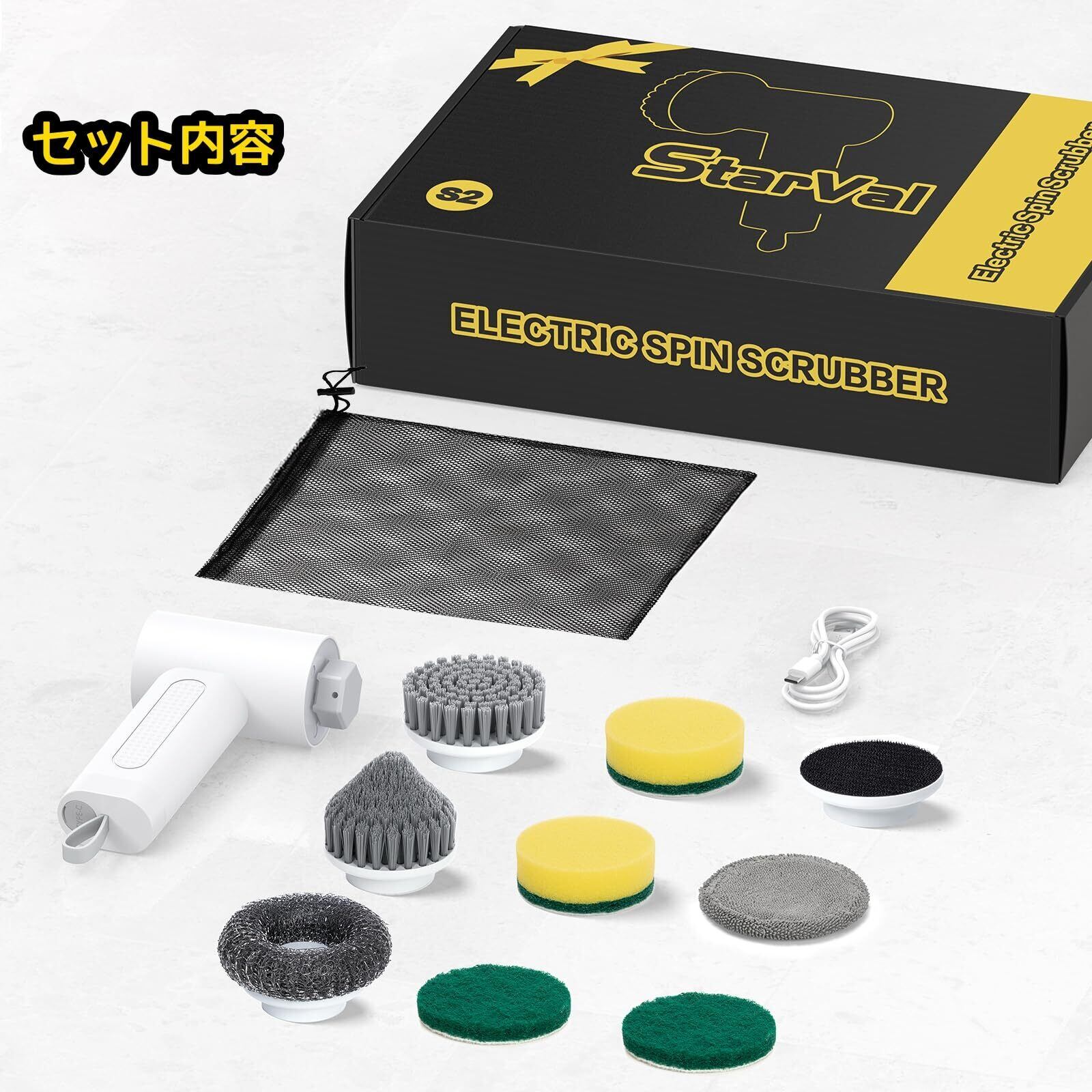 【パッケージ内容】本商品には、1* 電動スクラバー、1* 平ブラシ、1* スチールワイヤーブラシ、1* コーナーブラシ、2* スポンジブラシ、2* スコーリングパッド、1* クリーニングクロス、1* マジックテーププレート、1* 充電ケーブル(アダプターは含まれていません)、1* 収納ネットバッグ、1* ユーザーマニュアルが含まれています。