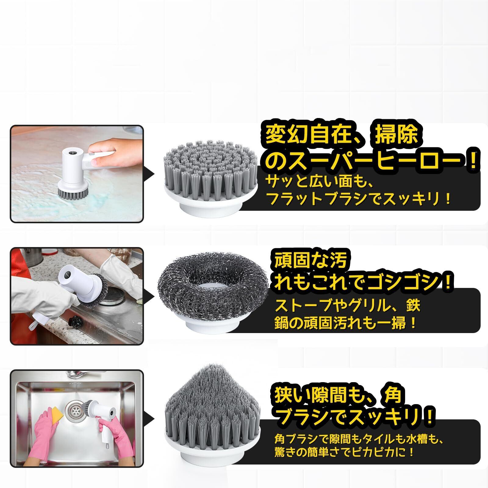 【8種類の取り替え可能なブラシヘッド】この電動スクリバーは、8種類の多機能ブラシヘッドを搭載しており、すべての清掃ニーズに対応します。キッチンやバスルーム、手の届きにくい場所にも最適です!浴槽、グリル、コンロ、シンク、床、目地、ホイール、窓などを楽に清掃し、お家をピカピカの新築同様に蘇らせます!