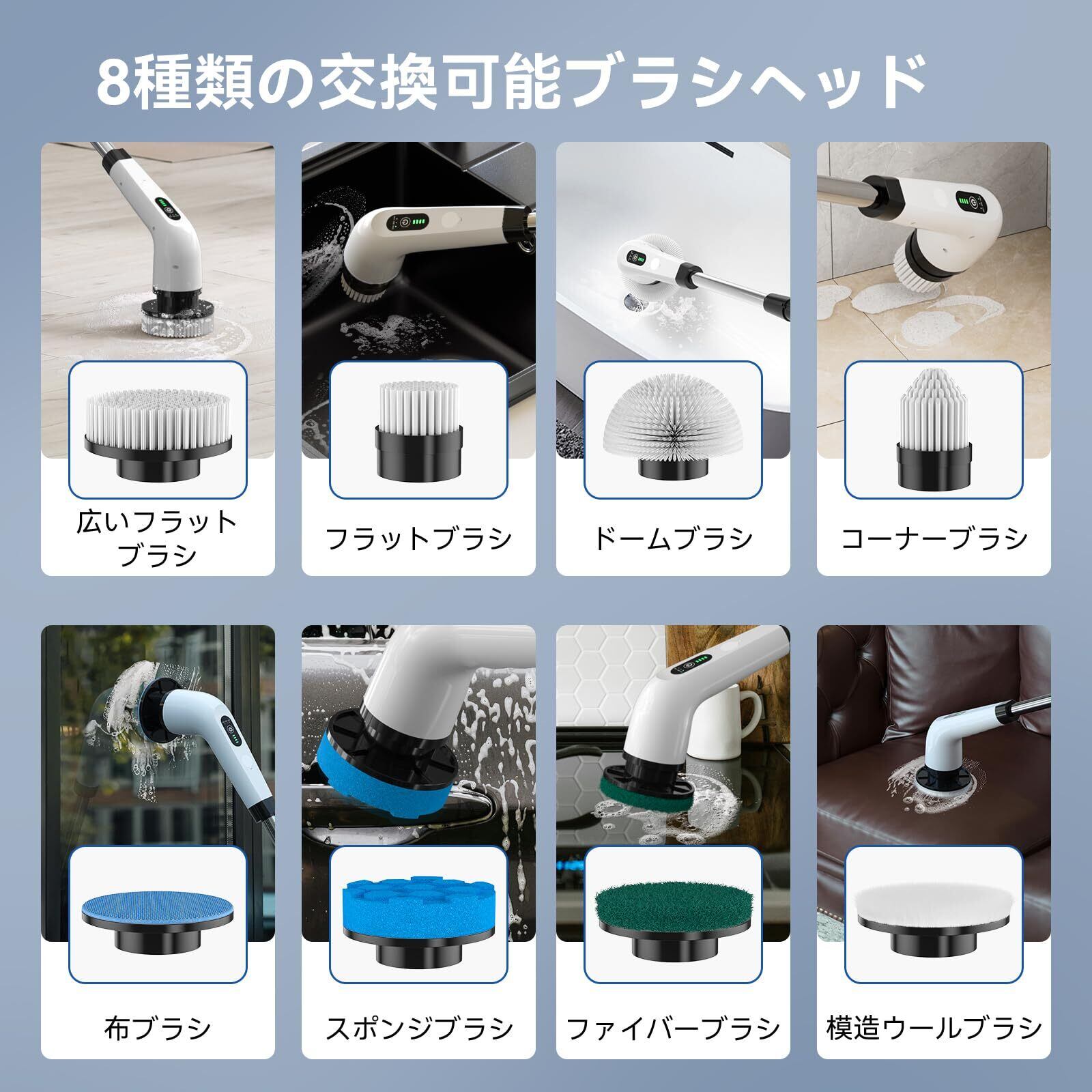 【11 in 1電動お掃除ブラシ】電動ポリッシャーには、9つのブラシヘッド、充電ケーブルと収納袋が付属しており、場所に合わせて異なるブラシが自由に選択してください。コーナーブラシはお風呂の縁、コーナ、ドアの隙間に適用。ドームブラシは浴槽、洗面台に適用。広いフラットブラシは床に適用。スポンジブラシと布ブラシは窓に適用。タオルパッドは木の床、バッグに適用。ファイバーブラシは台所に適用。ウールブラシは、ソファーや車磨きに適用。マジックテープディスクとスポンジプラシがセットになり、取り外したらマジックディスクを確認できます。