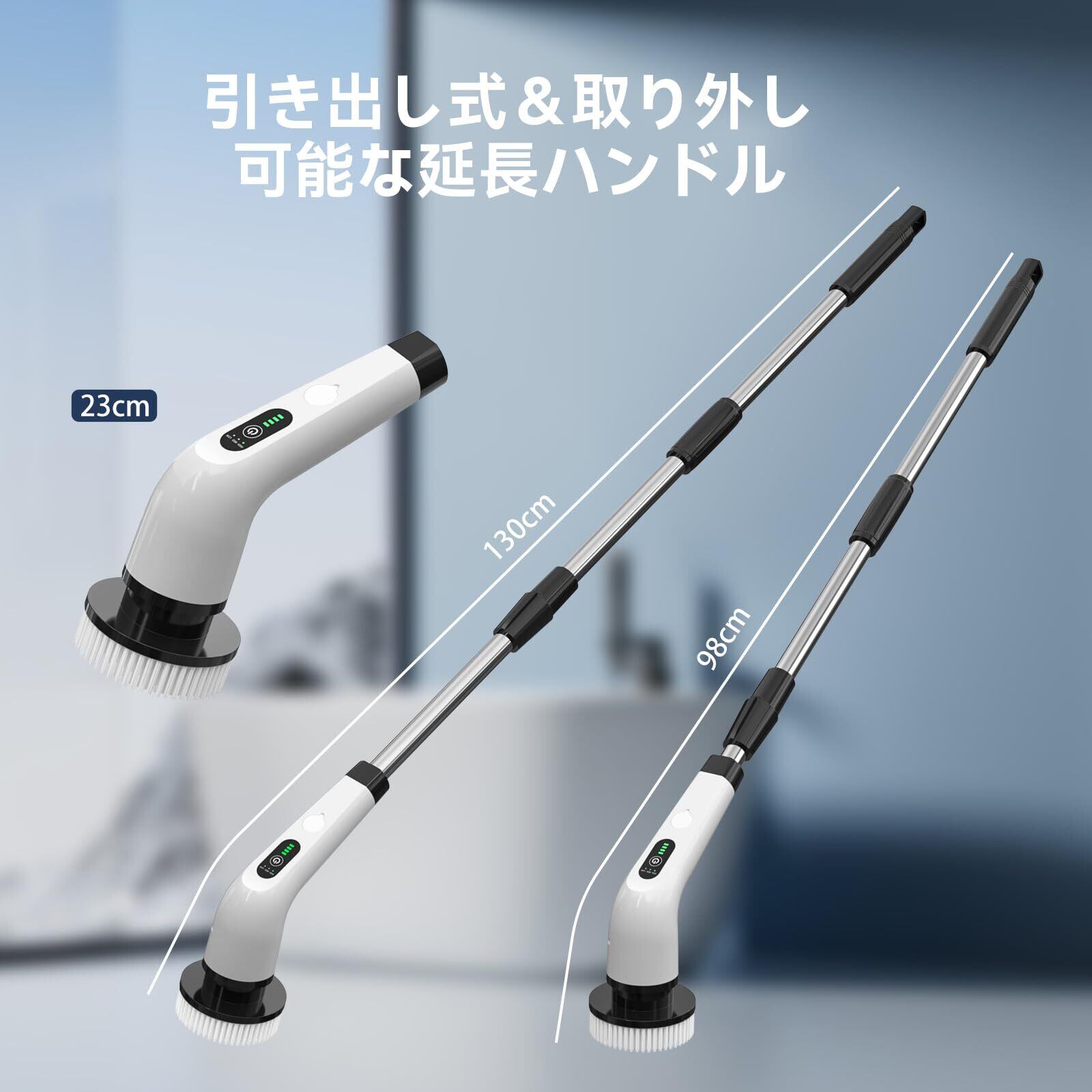 【進級ハンドルの取付方&3段式長さ伸縮可能】Mesqool最新版風呂掃除ブラシCB1001はハンドルの取付方を回転設置に変更することで、ハンドルが落ちやすいという問題が解消され、指を挟むという事態もなくなり、主婦たちが安全・安心な清掃作業を実現できます。お風呂掃除電動ブラシCB1001が取り外せる3段設計により、実際の清掃距離によって、延長ハンドルの取り付け、取り外しを通して、23~130CMの長さを自由に調節出来ます。腰をかがめず、浴槽から天井までのお掃除を軽々届きます。