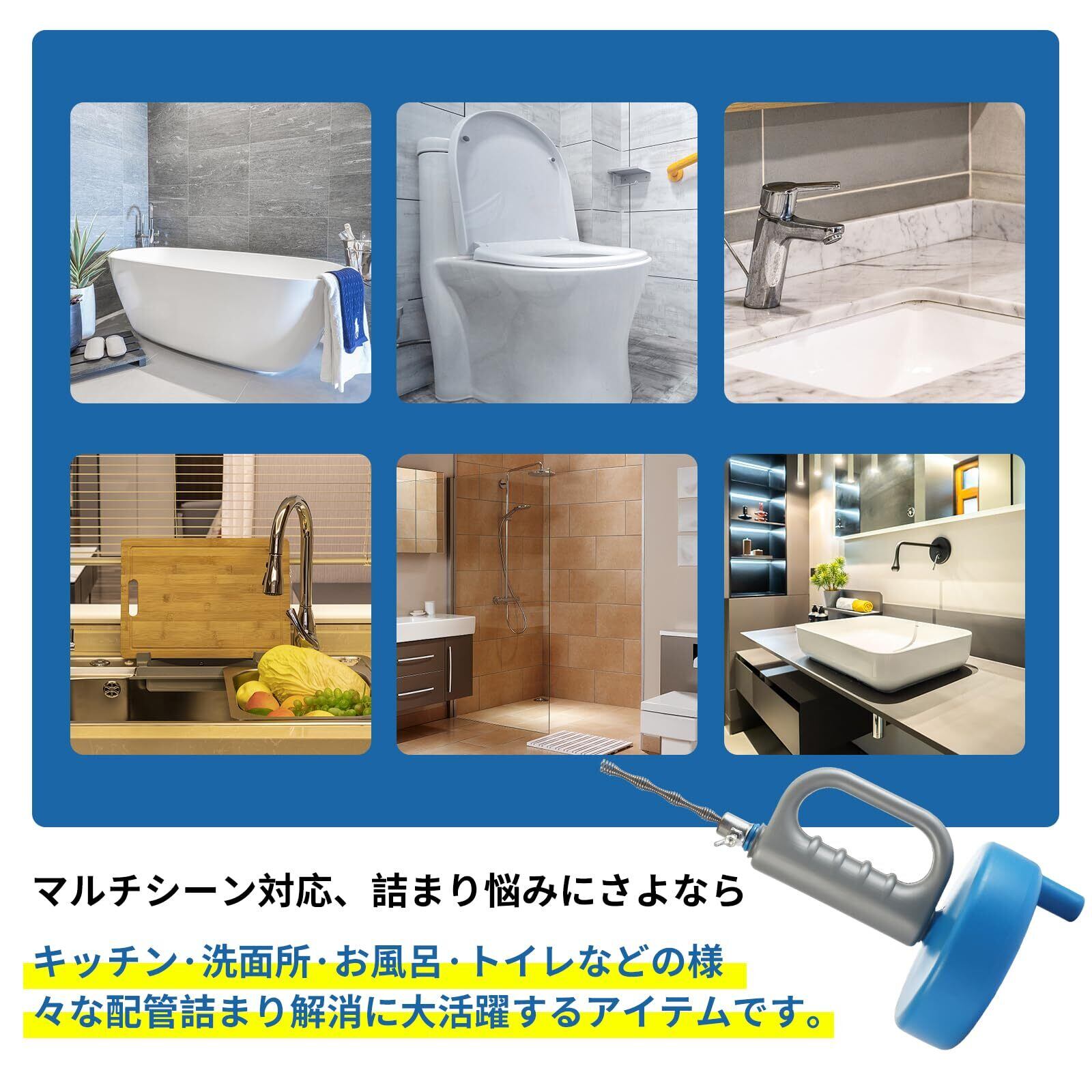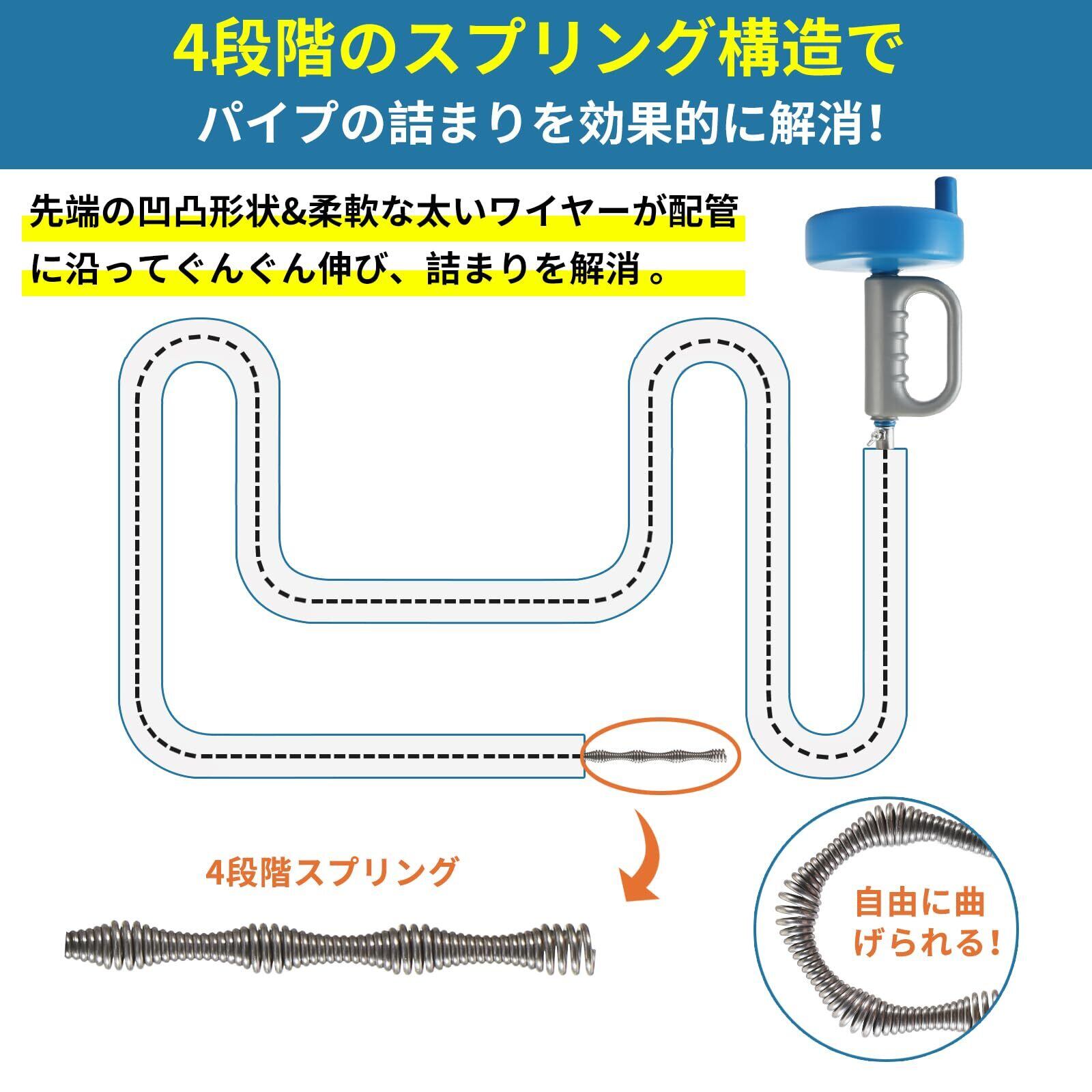 【幅広い用途】回転ハンドルを使用すれば、Sトラップ・Pトラップどちらの曲がった排水溝にも使用ができるので、トイレや洗面所、台所のシンク、床排水用や他のパイプにもお使いいただけます。液体タイプやラバーカップで解消できない詰まりや汚れも、ワイヤーで取り除くことが可能です。