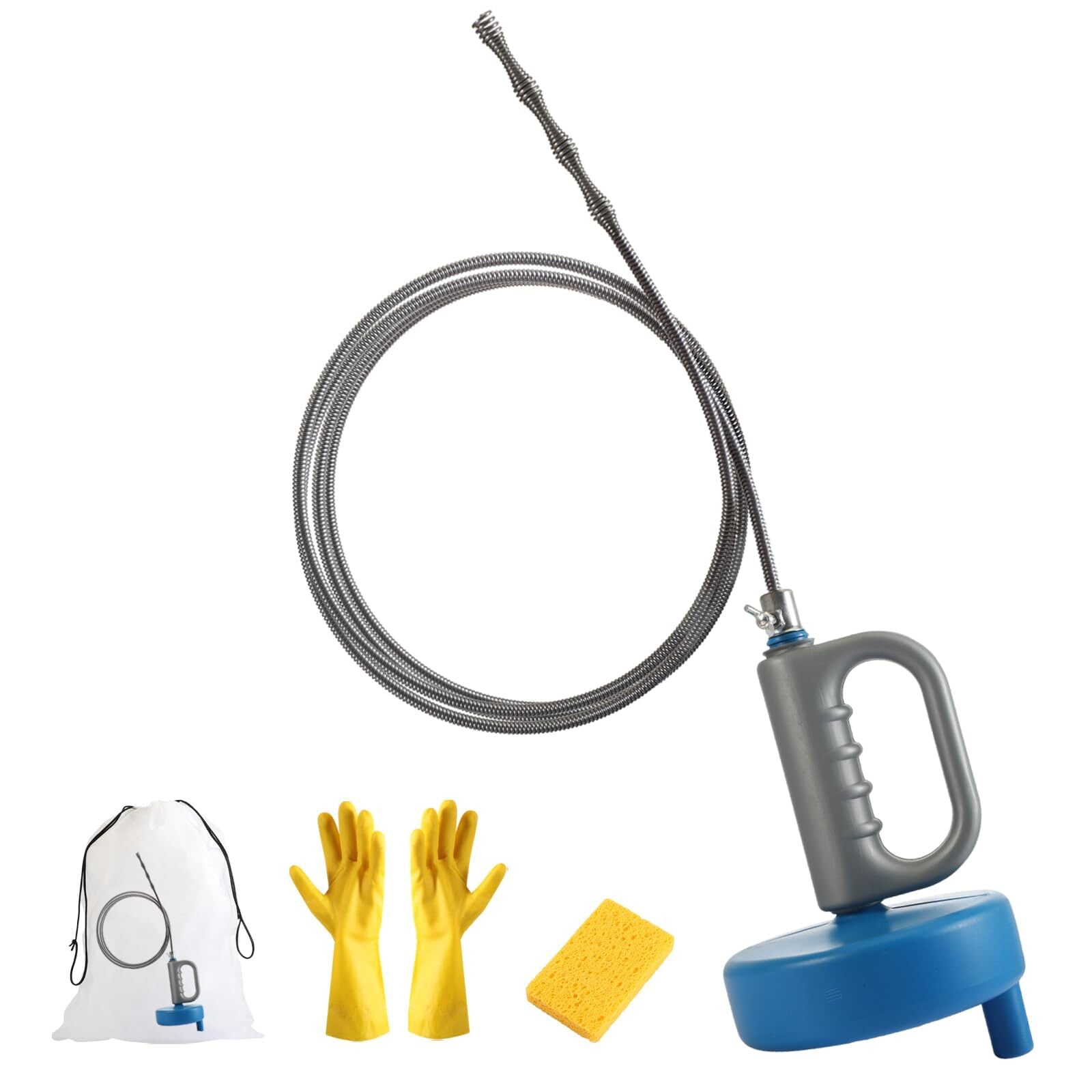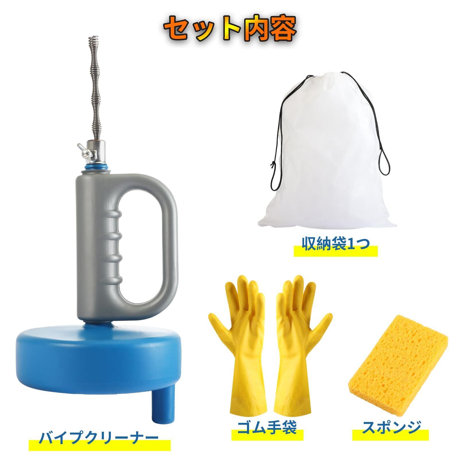 【セット内容】パイプクリーナー本体(5m)、ゴム手袋、専用袋、スポンジ。ワイヤー式のクリーナーで使用後もコンパクトに収納ができます。