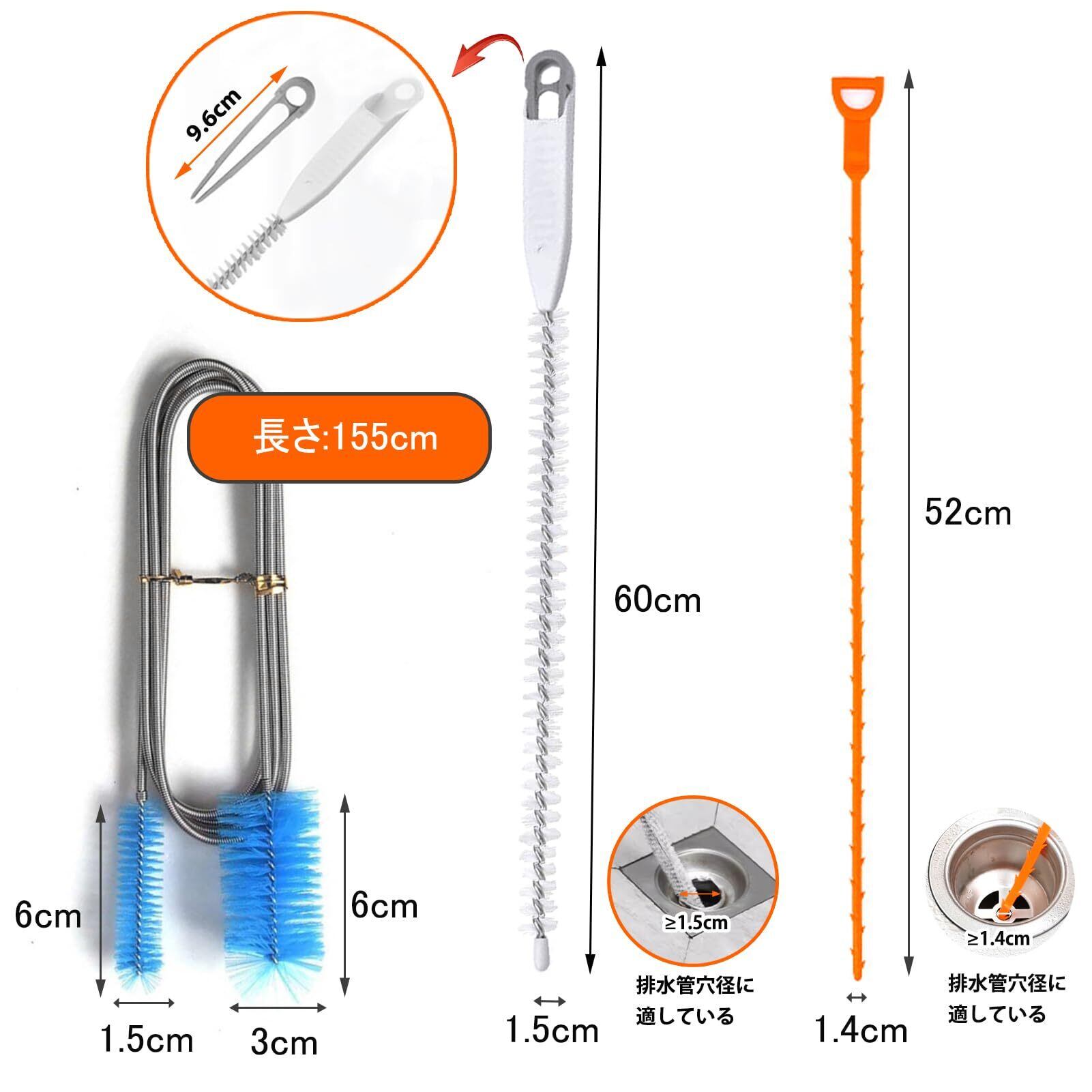 【セット内容】: 155cm 両端パイプ掃除ブラシ (1PCS)、クリーニングペンチ付き60cm新型パイプブラシ (1PCS)、52cmプラスチックパイプクリーナー (1PCS)。排水管の掃除、狭いパイプの掃除、手の届きにくい場所の掃除など、このセットには適当なツールが揃っています。