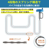 【高強度ワイヤーで簡単除去】パイプに通しやすい特殊設計の高強度ワイヤーを採用。4つの特殊な凹凸形状を回転させることで、あらゆる汚れを絡め取ることができます。パイプに沿ってワイヤーを伸ばしていき、つまり部分に到着したらハンドル部分を回転させクルクルと回すことで詰まっている物がワイヤの先端によりからめとれます。