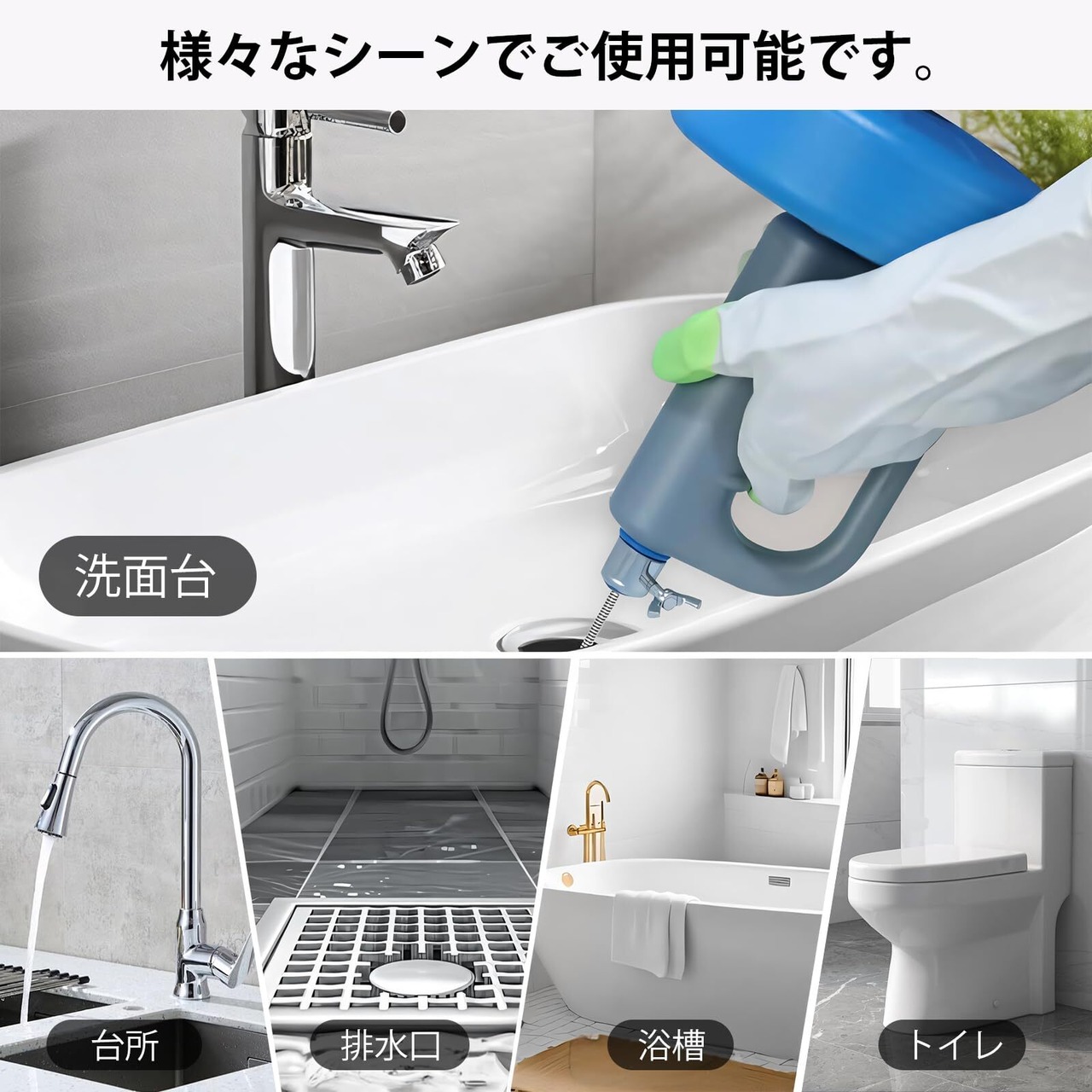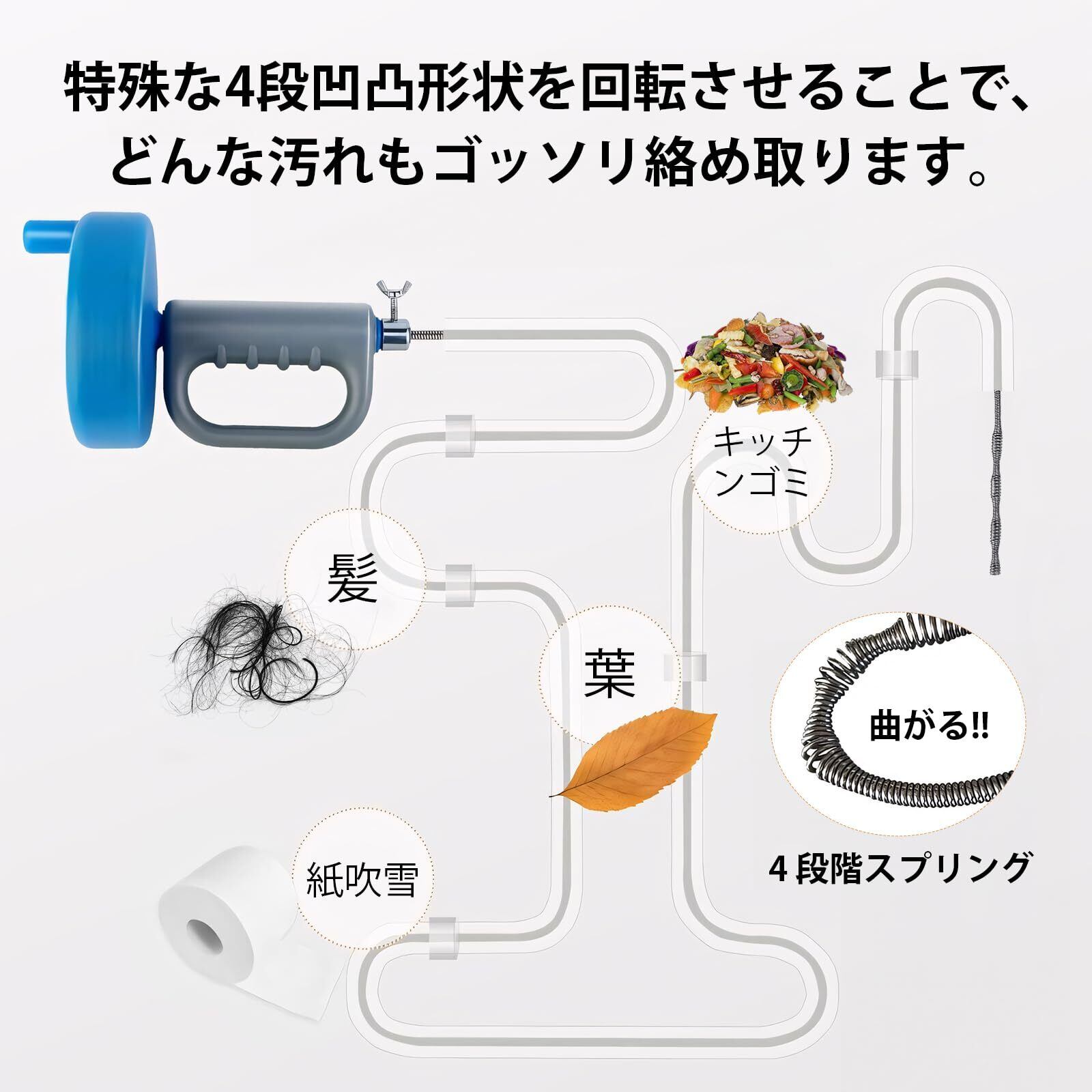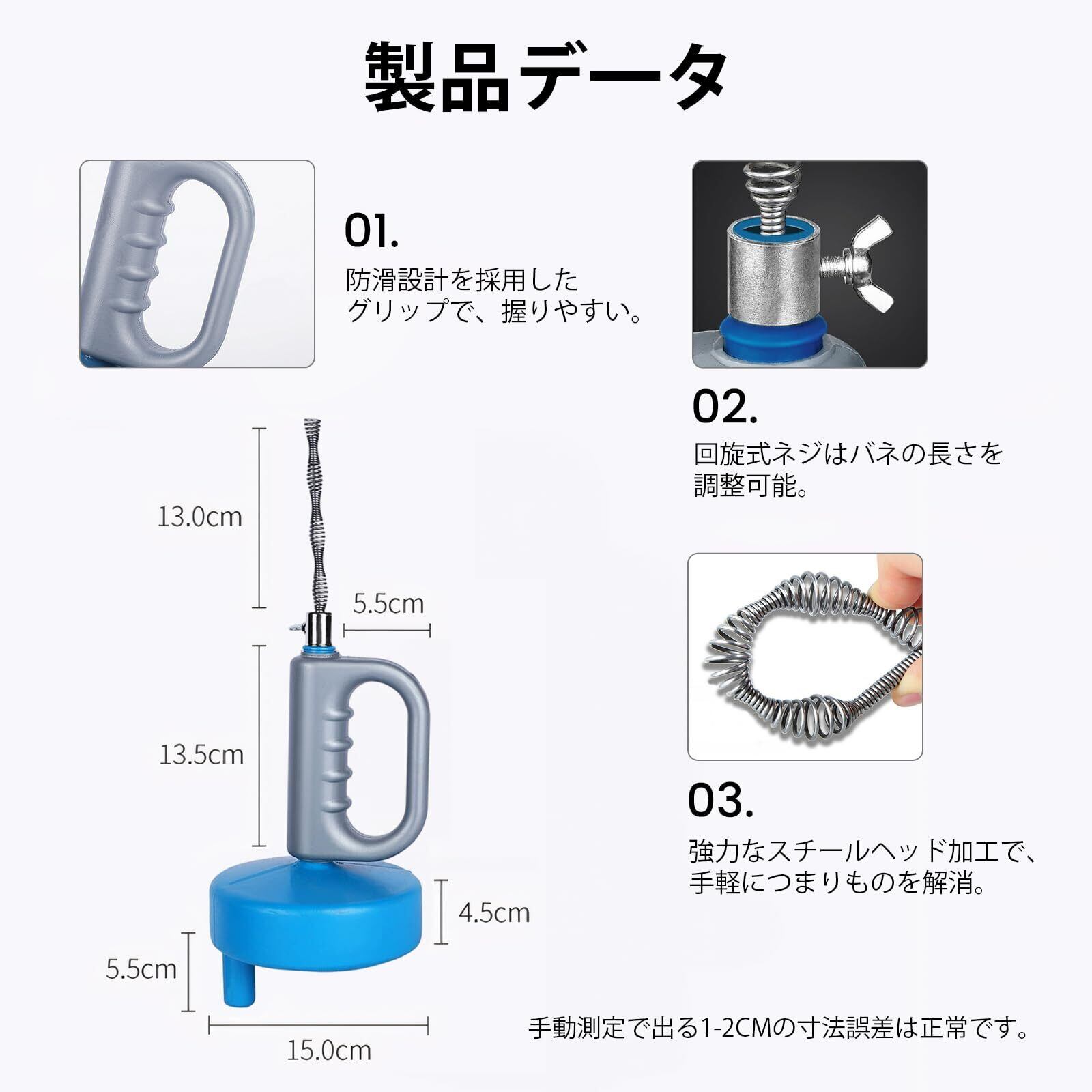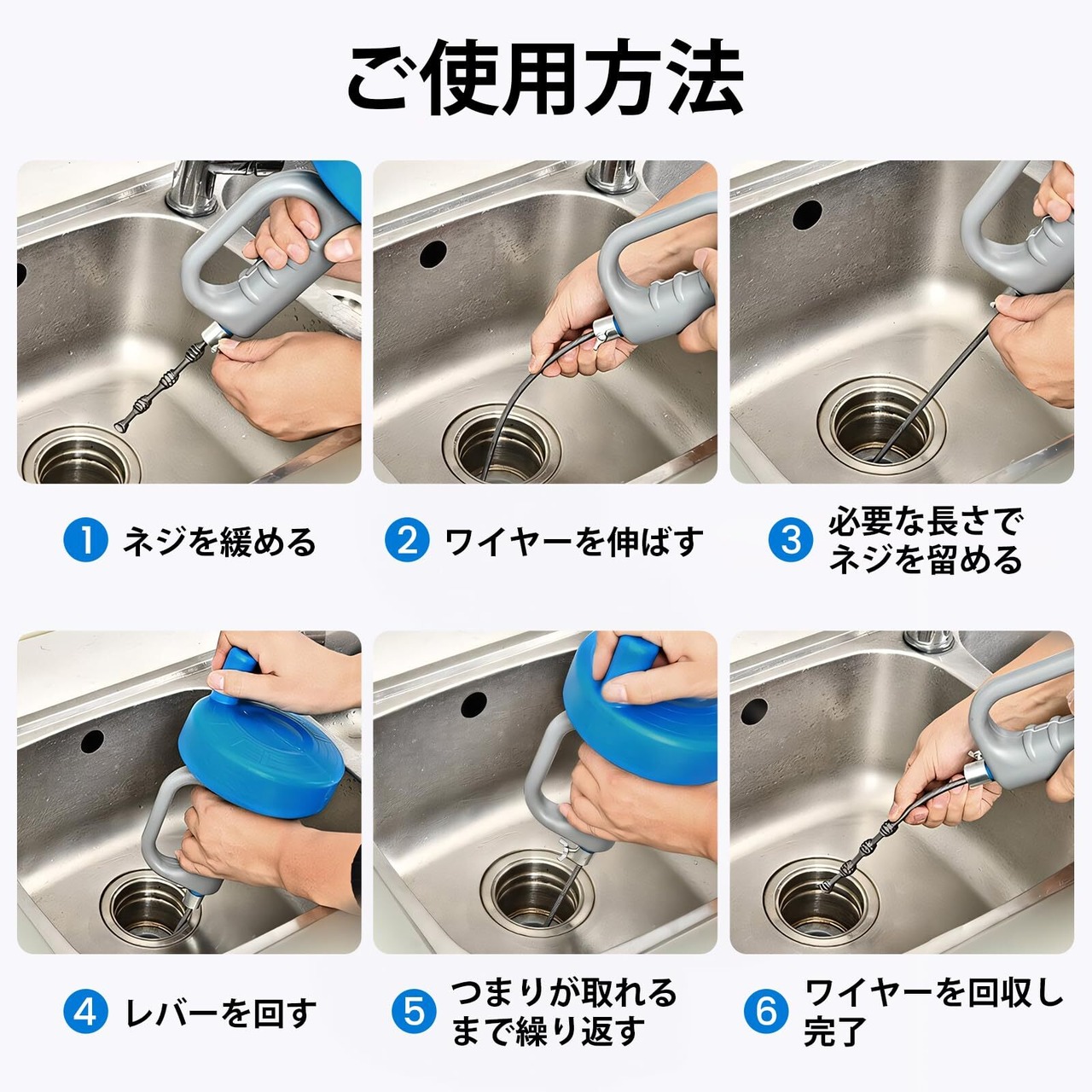 【使用上の注意&家庭として必要品】5mの場合:4.5mを超えると、ワイヤーが本体から抜け落ちる可能性があります。ワイヤーを排水溝に落とさないよう、ワイヤーの残りに気を付けてご使用ください。また、無理にワイヤーを引っ張るとワイヤーが外れ壊れる可能性がありますので、無理に引っ張らないようご注意ください。