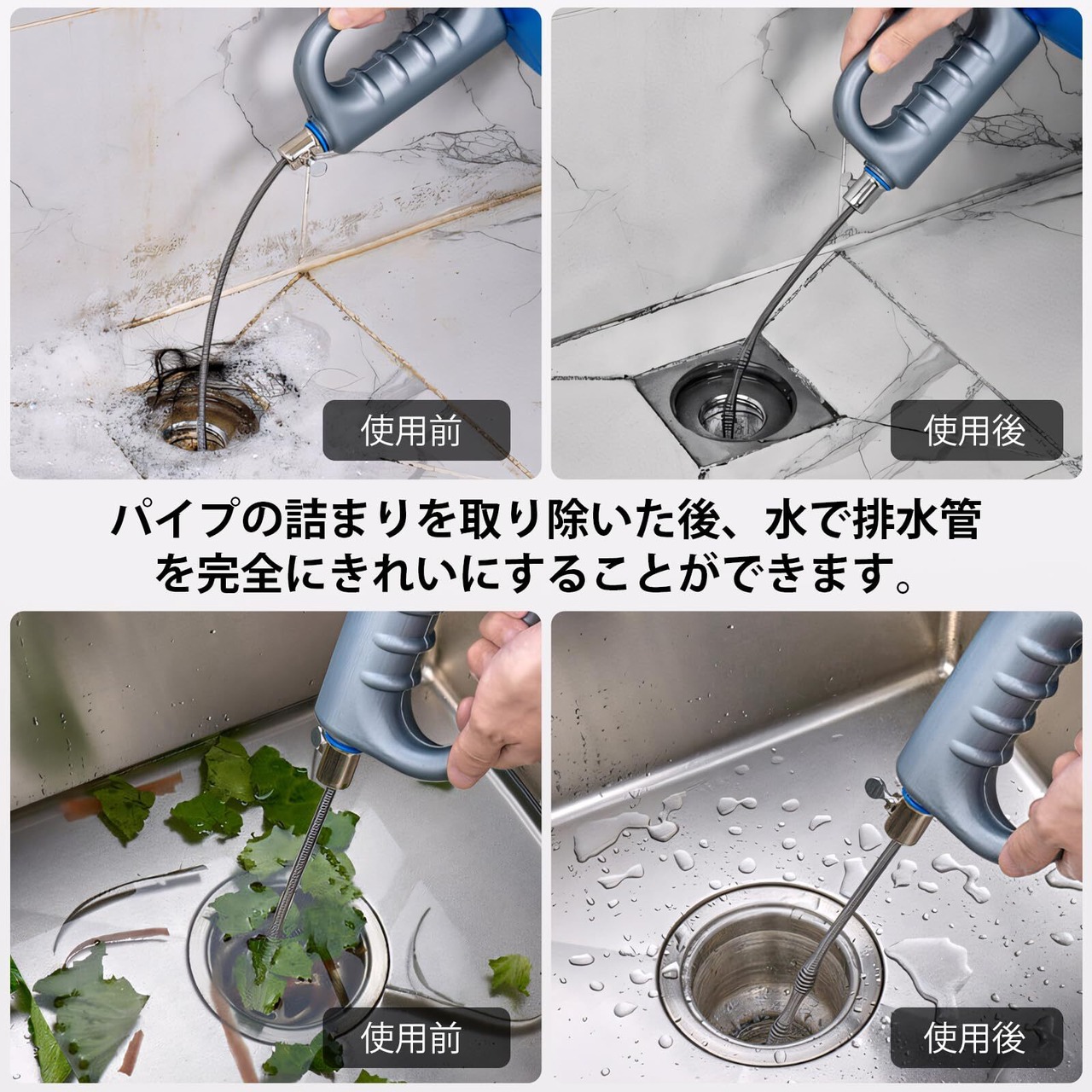 【独特の設計&耐久性が優良】パイプクリーナーワイヤーはエルゴノミクスに基づき、ピストル式のハンドル設計を採用しています。それによって、力を集中しやすく、落ちにくくなります。パイプクリーナーワイヤーは繰り返し使用可能です。強化されたハンドルと5メートルの長いばねワイヤーにより、毛などの詰まり物が多い短い排水溝はもちろん、長い排水溝も簡単に掃除することができます。