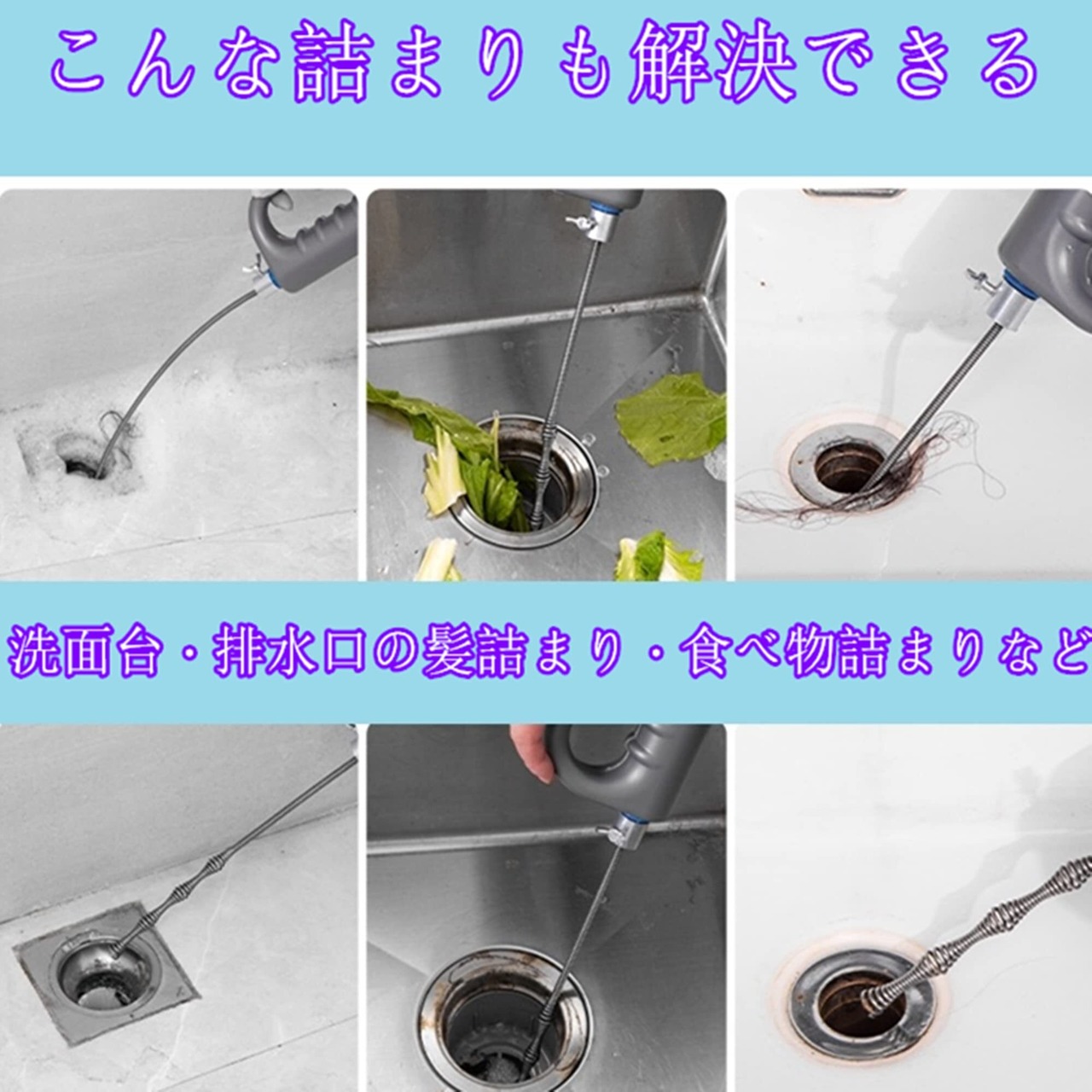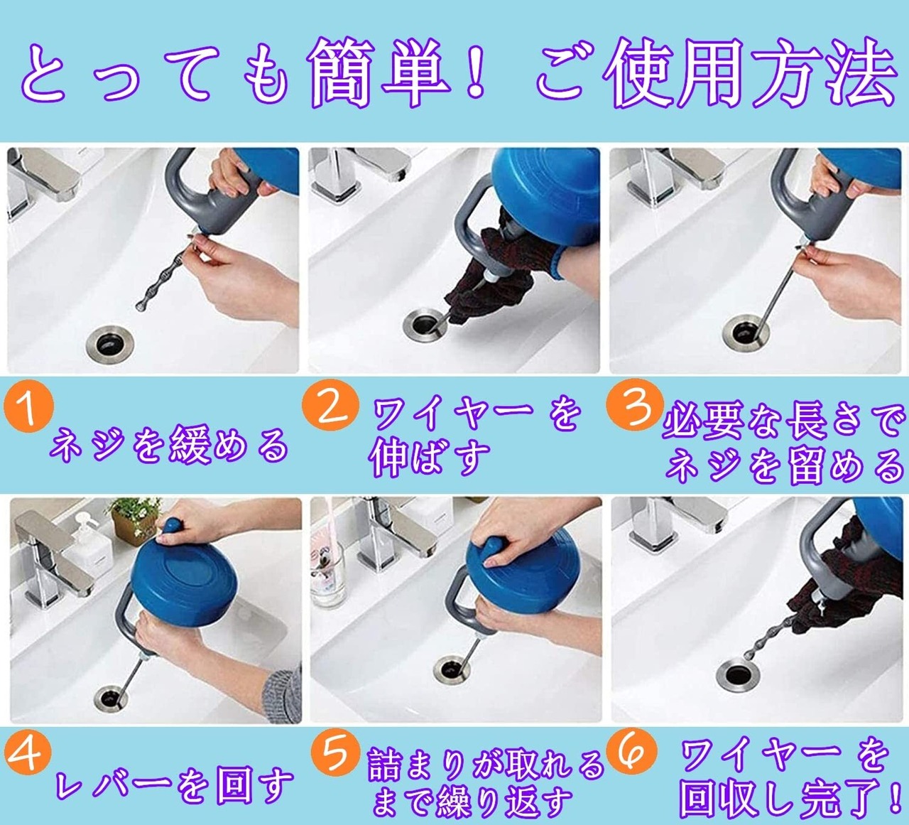【業者要らず】業者に頼らずに水回りのトラブルを解消できるワイヤー式パイプクリーナー。液体タイプやラバーカップで解消できない詰まりや汚れも、ワイヤーで取り除くことが可能です。業者に頼らずに水回りトラブルを解消できる、家計に優しいパイプクリーナーです。液体タイプやラバーカップで解消できない詰まりも、ワイヤーで取り除くことが出来ます。排水管やトイレのつまりを解消するために、用途に合わせて長さが選べる家庭用パイプクリーナー(5m/10m)。 女性一人でも簡単に使え、汗だくにもならず、手も汚れないから、配管掃除が楽になります。電池いらずのエコ設計。パイプに沿ってワイヤーを伸ばしていき、つまり部分に到着したらクルクルと回すことで詰まっているゴミ、汚れなどつまりの原因となっているものを先端のヘッド部分で取り除きます。