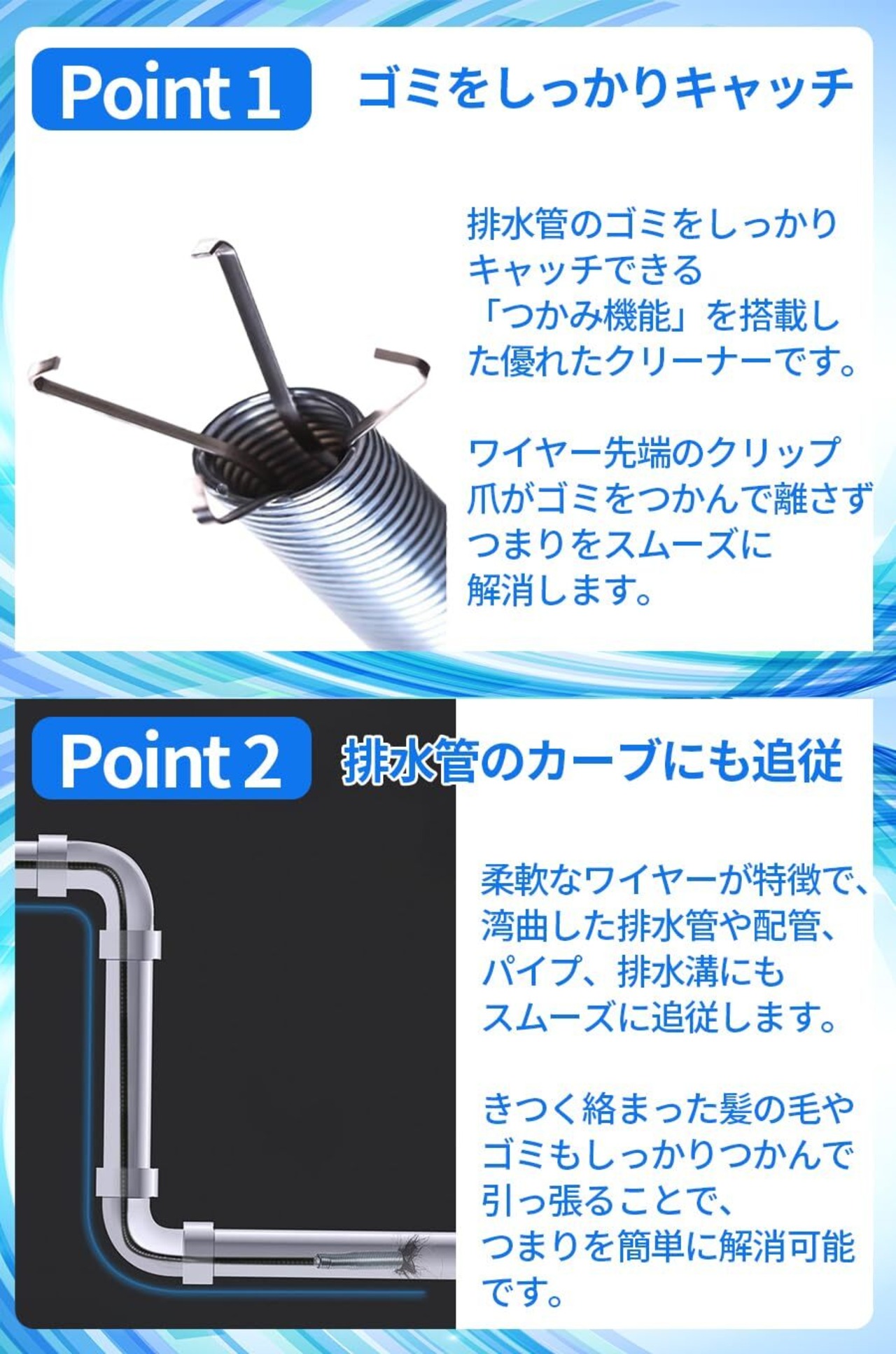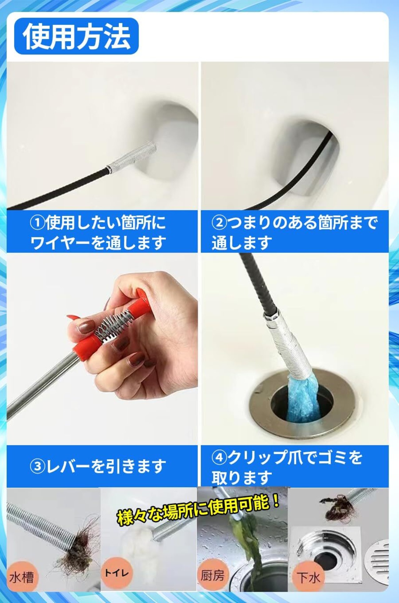 【柔軟なワイヤー】曲がりくねった排水溝でも、このワイヤーならスムーズにゴミを除去できます。トイレやシンク、台所などの詰まりに効果的です。