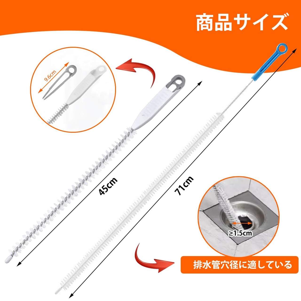 ②長さ約45/71cm、直径2.5cm。パイプ掃除ブラシは細くて長いので、パイプの奥まで入り込んで掃除することができ、パイプの流れを改善し、排水管をきれいにすることができます。