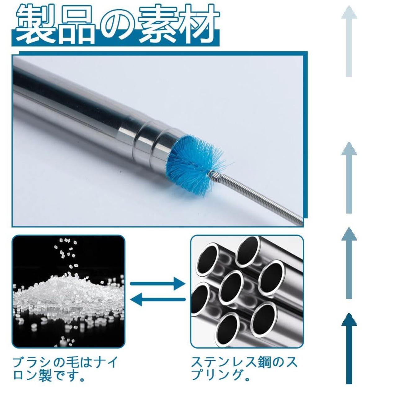 【商品素材】 ブラシ部分は高品質ナイロン製で密な毛密度を実現。シャンク部分は柔軟なステンレス鋼スプリングを採用し、自由な伸縮と曲げに対応。