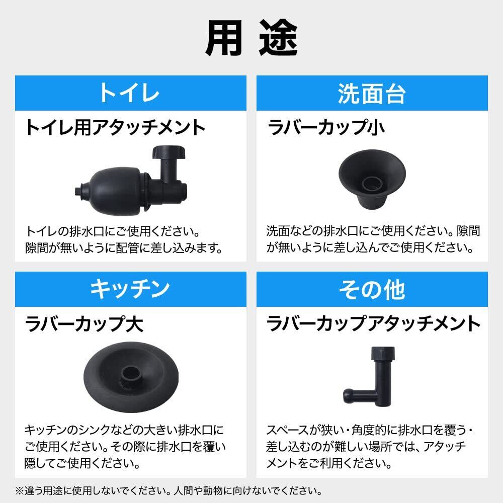 手動ポンプで空気をご使用場所の圧力目安まで本体にためます。付属のキャップに交換することによって様々な場所にご使用が可能です。【圧力目安】2~3bar/洗面台、3~4bar/台所、4~5bar/トイレ、5~6bar/地面排水口