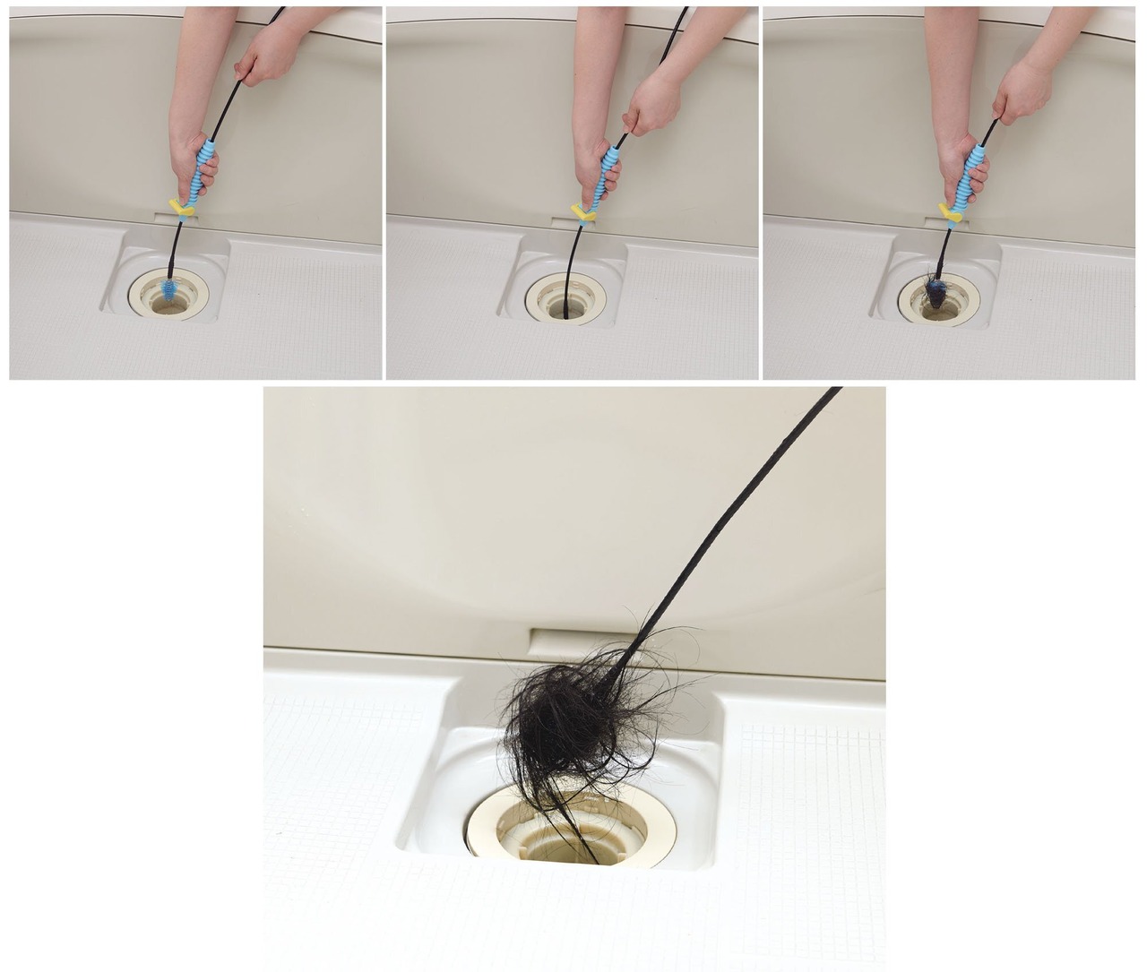 1. 排水口に本製品のブラシ部分をゆっくりと挿入します。 2. ブラシを回転させながら、髪の毛や汚れを絡め取ります。 3. 汚れが取れたら、ゆっくりと引き上げます。 4. 使用後は水で洗い流し、乾燥させて保管してください。 ※無理な力を加えないでください。