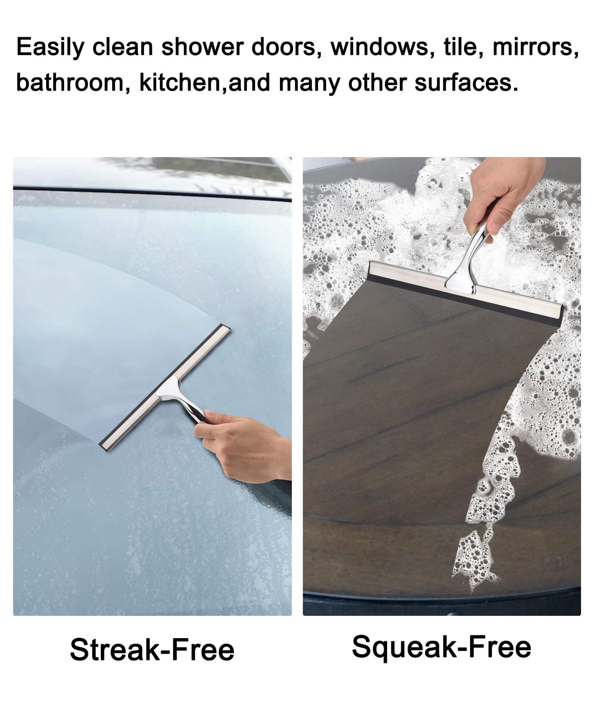 使用前にゴム製のブレードヘッドを湿らせてください**** 筋のない輝き:この万能なスクイージーを使用して、ガラスやその他の表面から石鹸カスや水垢の蓄積を簡単に取り除きます。 お気に入りの家庭用クリーナーと組み合わせることで、筋やきしみのない輝きを実現します。