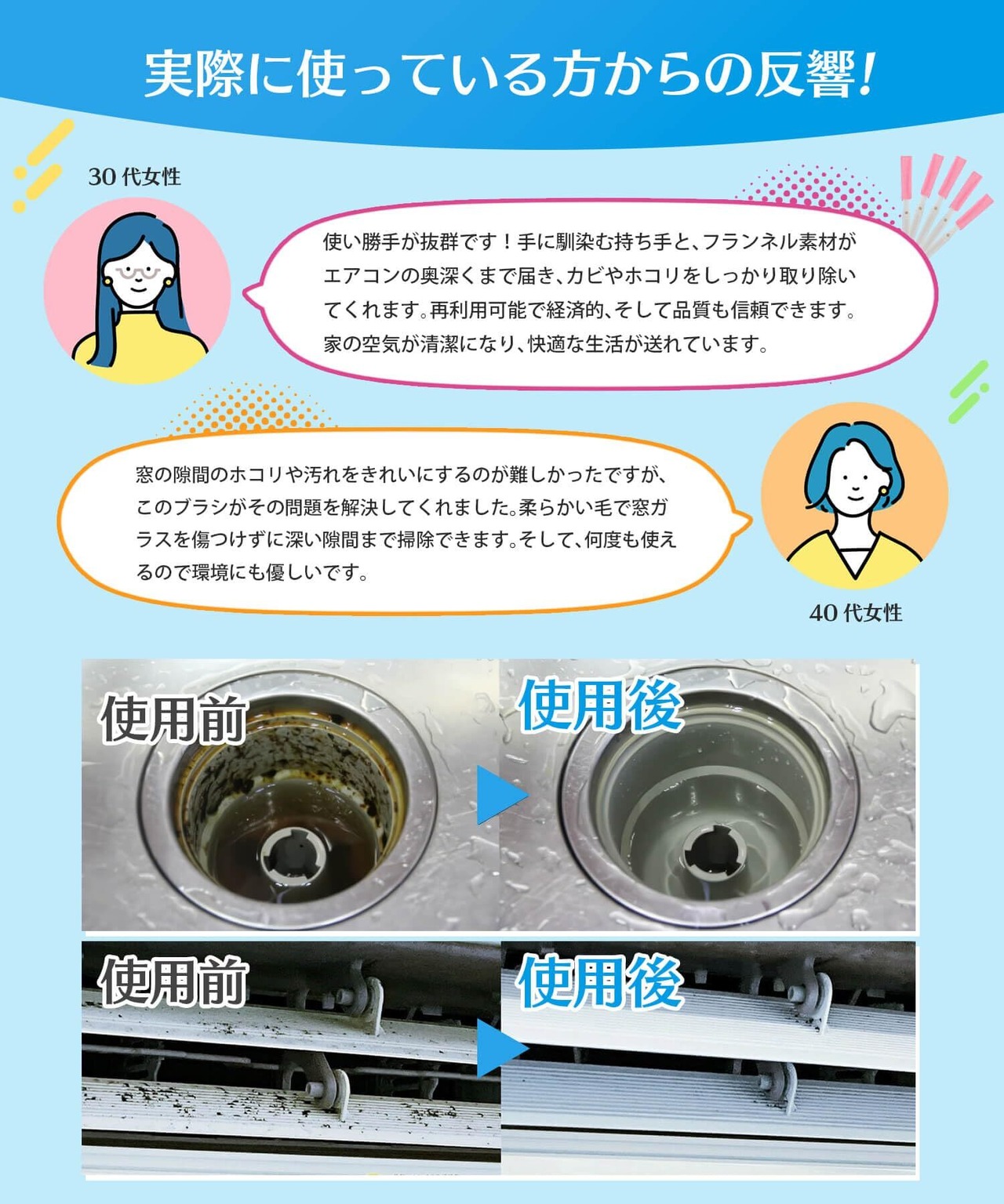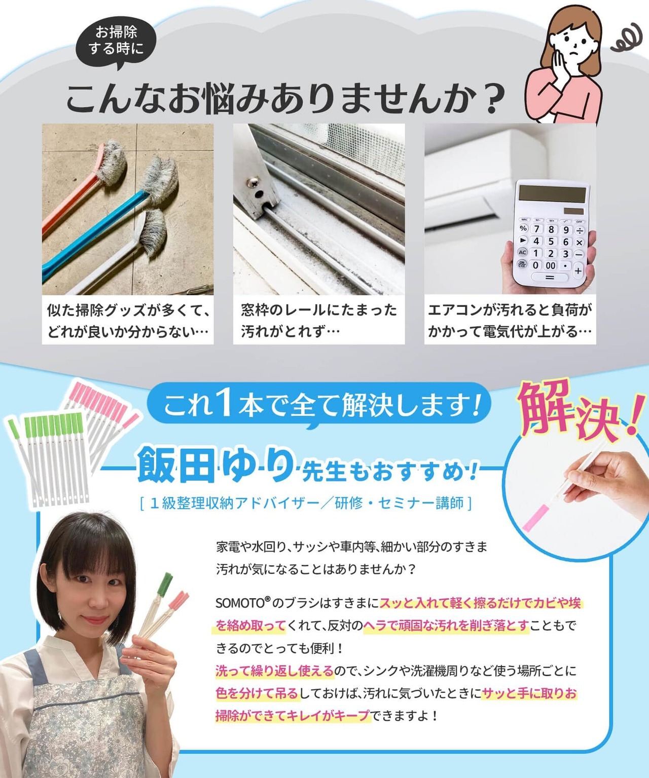 ✨『整理収納アドバイザーのプロも推薦』整理収納アドバイザー1級とクリンネストの資格を持つ飯田ゆり先生からのプロのお勧めです。上質なフランネル素材を使用することで、隙間や細かい部分の掃除に役立つ、これまで手の届かなかった狭いエアコン ファン(シロッコファン)などの家電の隙間や水回り、サッシや車内などにも奥まで届き、カビやホコリの汚れを絡め取ります。SOMOTO エアコン 掃除 ブラシはすきまにスッと入れて軽く擦るだけでカビや埃を絡め取ってくれて、反対のヘラで頑固な汚れを削ぎ落とすこともできるのでとっても便利!洗って繰り返し使えるので、シンクや洗濯機周りなど使う場所ごとに色を分けて吊るしておけば、汚れに気づいたときにサッと手に取りお掃除ができてキレイがキープできます!