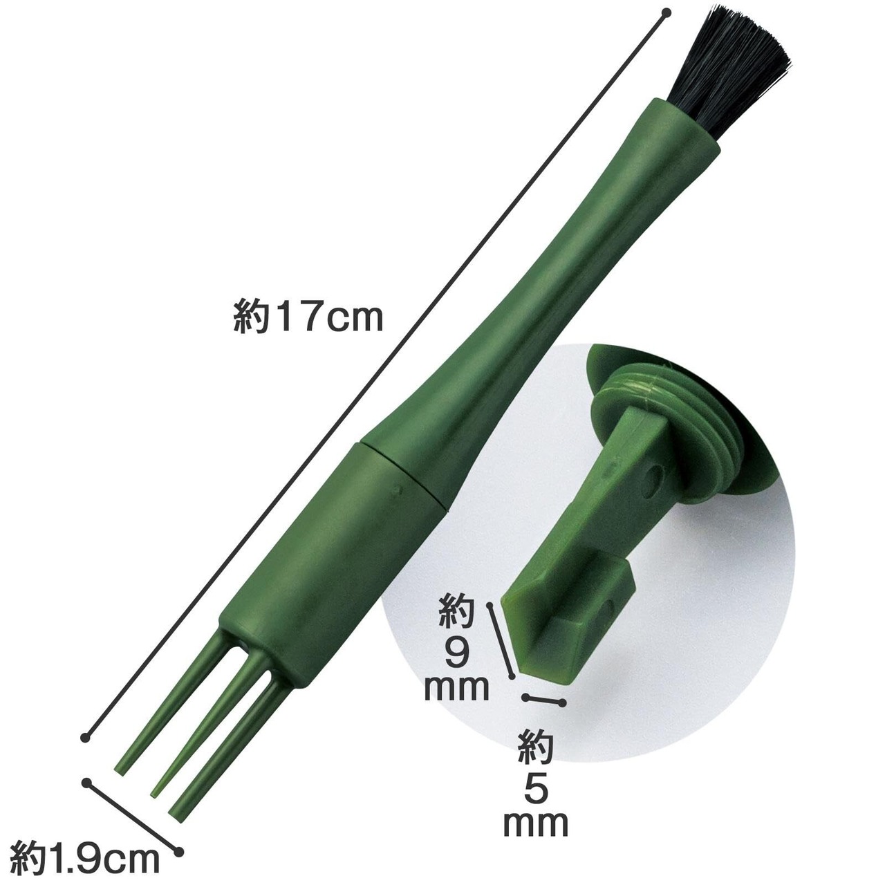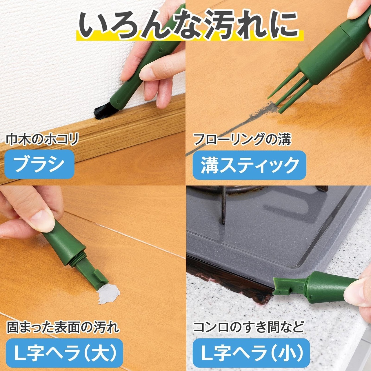 3サイズの溝スティックと大小のL字へラ、ホコリ取りブラシの3WAY!