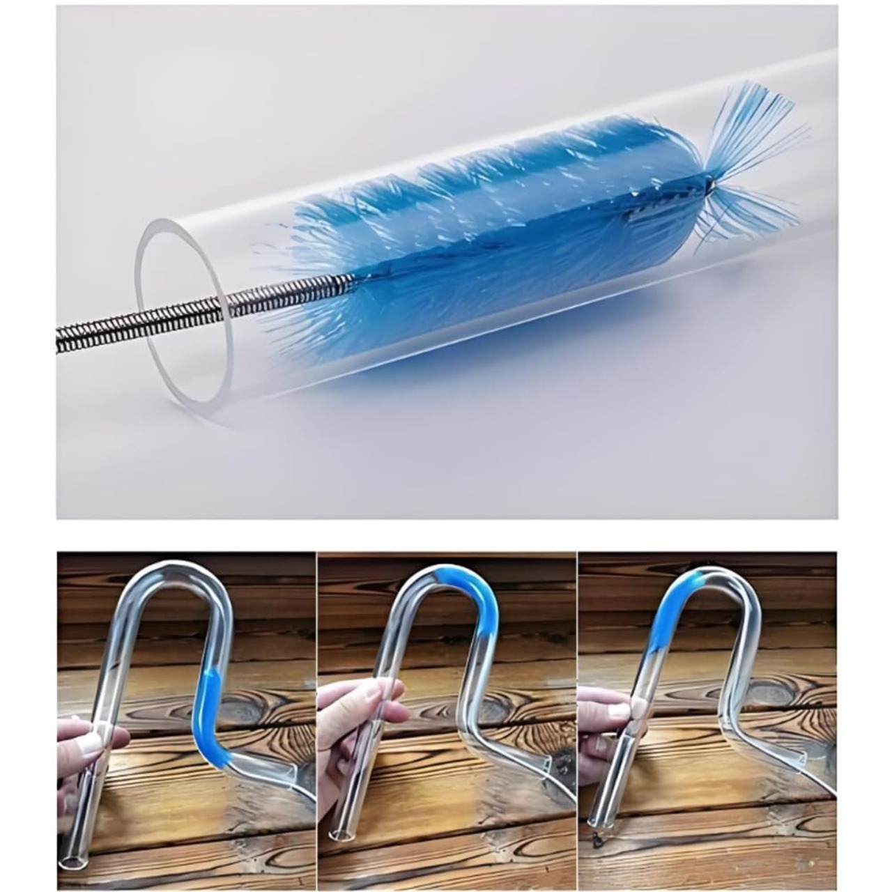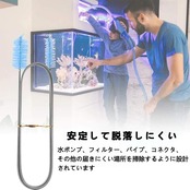 【延長式アーム設計】全長155cm×ブラシヘッド2サイズ(大径3cm/小径1.8cm)の4本組セット(ホワイト/ブルー各2本) 【多関節可動機構】ステンレスコア入りフレキシブルアームを採用。水槽U字管の屈曲部や蛇行配管内部へのアクセスを可能にする自在屈曲構造 【超薄型清掃ヘッド】ブラシ径1.8cmのスリムチップを装備。ろ過器スロット・パイプ継手部・エルボ金具等の微細隙間清掃に最適化 【ハイブリッド素材構成】ナイロン繊維ブラシ×ポリプロピレン軸の耐腐蝕設計。水回り専用ツールとして繰り返し使用可能な耐久仕様 【住宅設備メンテナンス対応】水槽配管清掃を中核に、浴室排水口・エアコン排水ホース・ペットケージ金網等のマルチユース設計