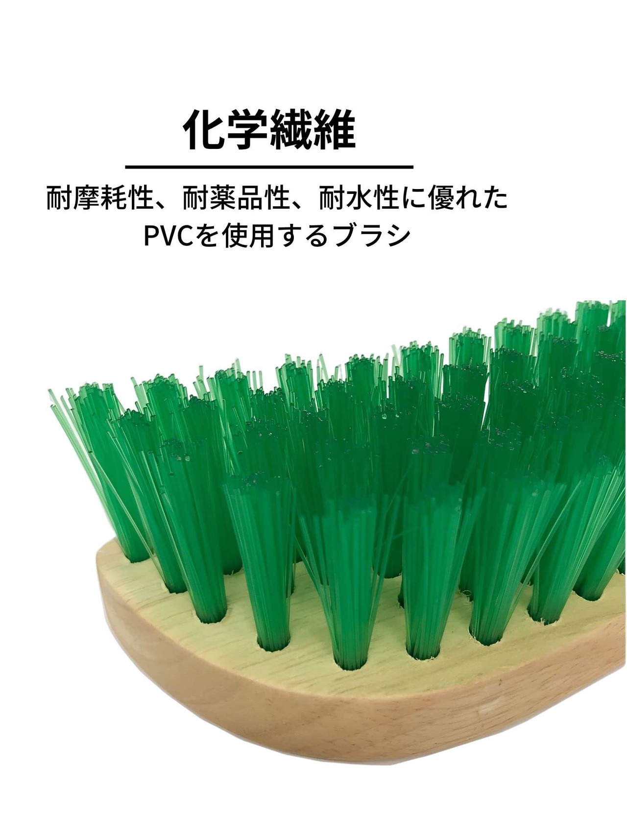 【特徴】木製の持ち手がついたハンディタイプのデッキブラシです。化繊ブラシなので毛が硬く、耐薬品性にも優れています。台は曲線になっているので手になじみ、力が入りやすくなっています。木製なので温かみがあり、焼き印風のロゴもオシャレです。