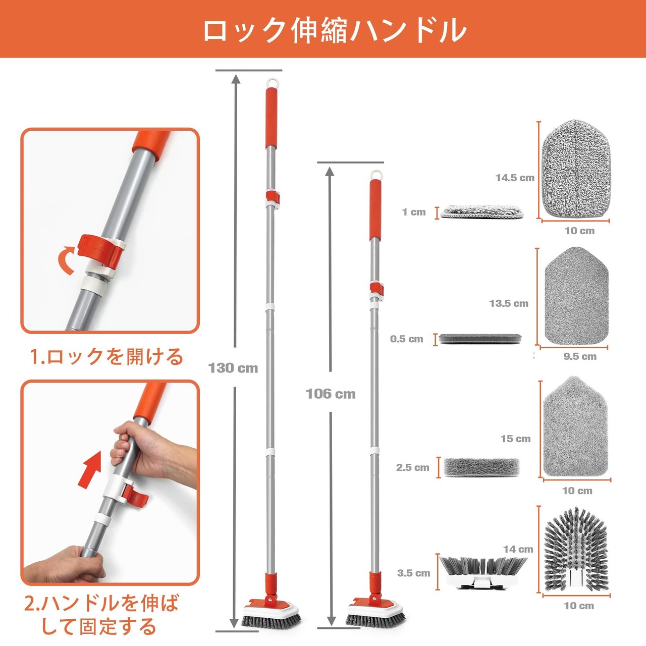 JEHONN デッキブラシ掃除用ブラシ伸縮ロング106-130cm,浴室の浴槽の流しの床の壁のための4つの異なったお風呂掃除 ブラシの頭部