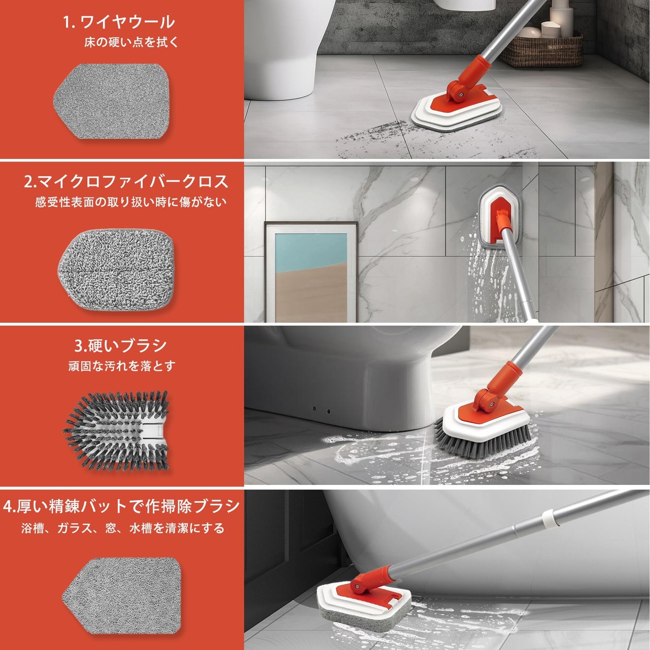 【人気商品】JEHONN デッキブラシ掃除用ブラシ伸縮ロング106-130cm,浴室の浴槽の流しの床の壁のための4つの異なったお風呂掃除 ブラシの頭部