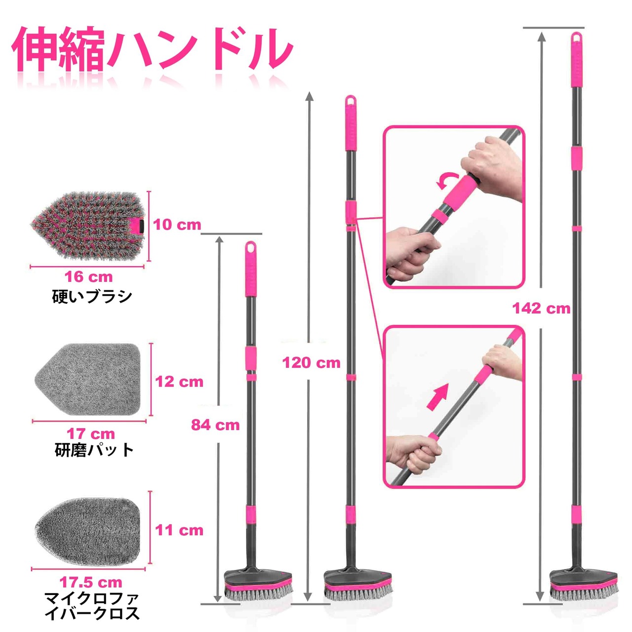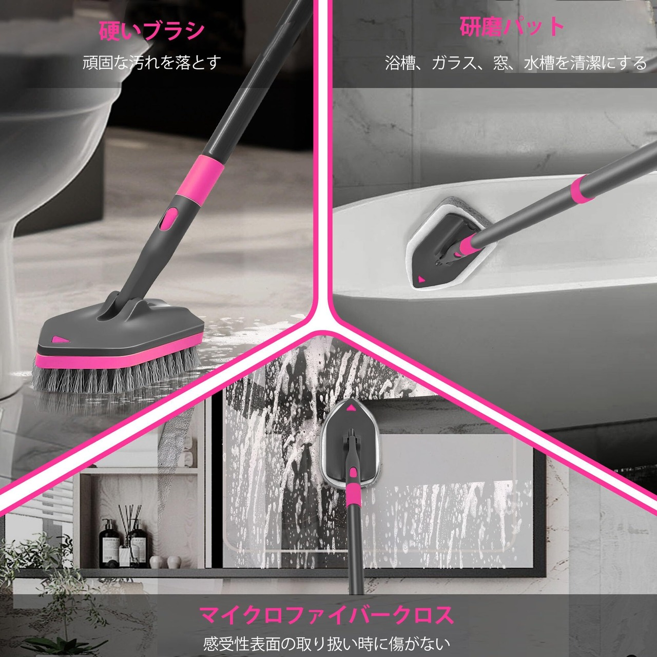 【数量限定】NEWE お風呂掃除 ブラシ,デッキブラシ 伸縮式ロングハンドル付 142cm,浴室床ブラシ クリーニング用交換ヘッド4個付きお風呂掃除用 浴槽 床 幅木 シンク キッチン トイレ(ローズ・レッド)