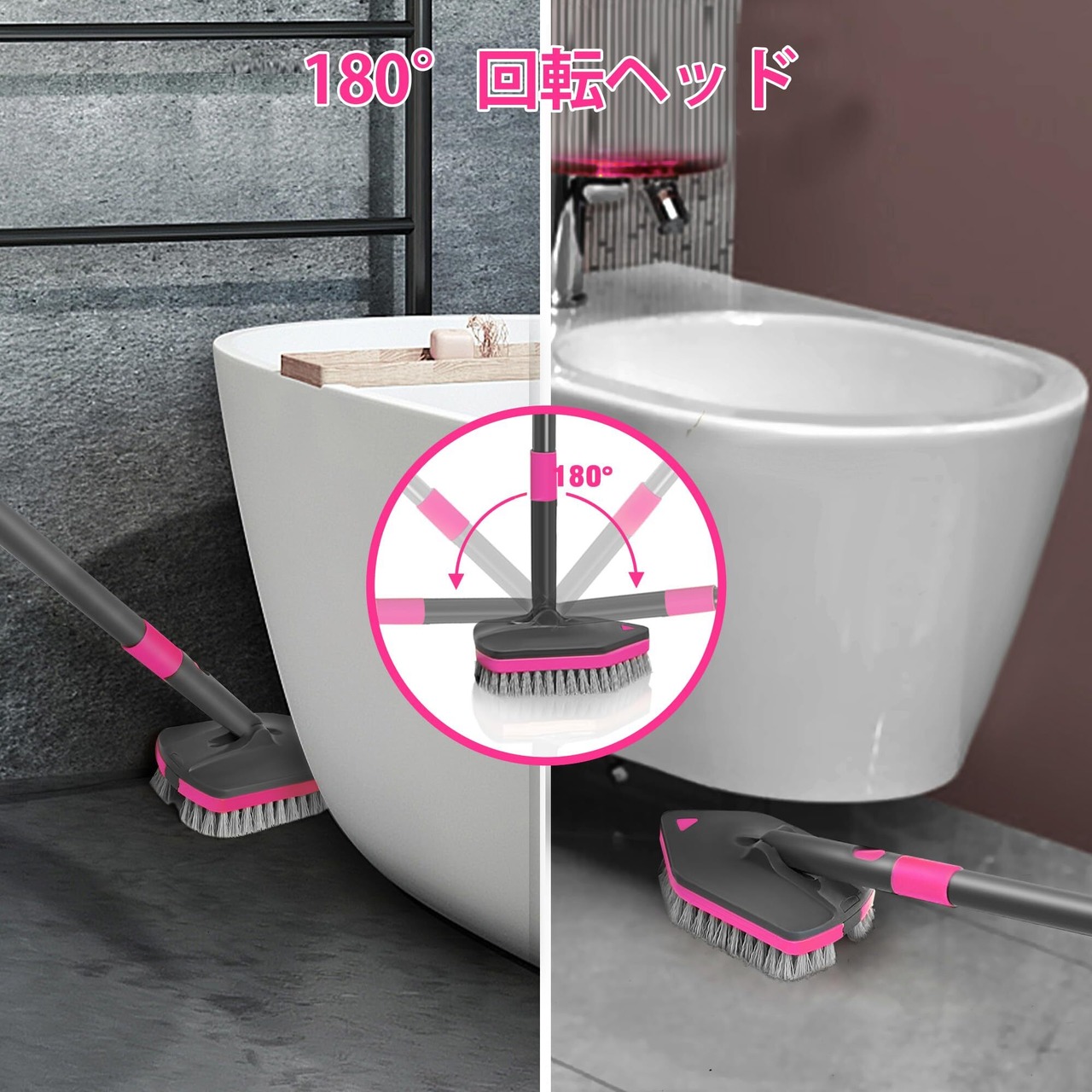NEWE お風呂掃除 ブラシ,デッキブラシ 伸縮式ロングハンドル付 142cm,浴室床ブラシ クリーニング用交換ヘッド4個付きお風呂掃除用 浴槽 床 幅木 シンク キッチン トイレ(ローズ・レッド)