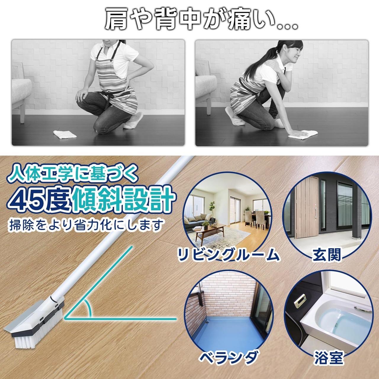 【人間工学に基づいた設計】デッキブラシは人間工学に基づいた45度の傾き設計で、掃除中膝や背中が痛らず、家事をする時の疲れを軽減してくれます。ブラシのハンドルは35cm、75cm、113cmの三段設計で、身長や作業場に応じで長さを調整できます。高い窓や低い床でも手軽く掃除できます。